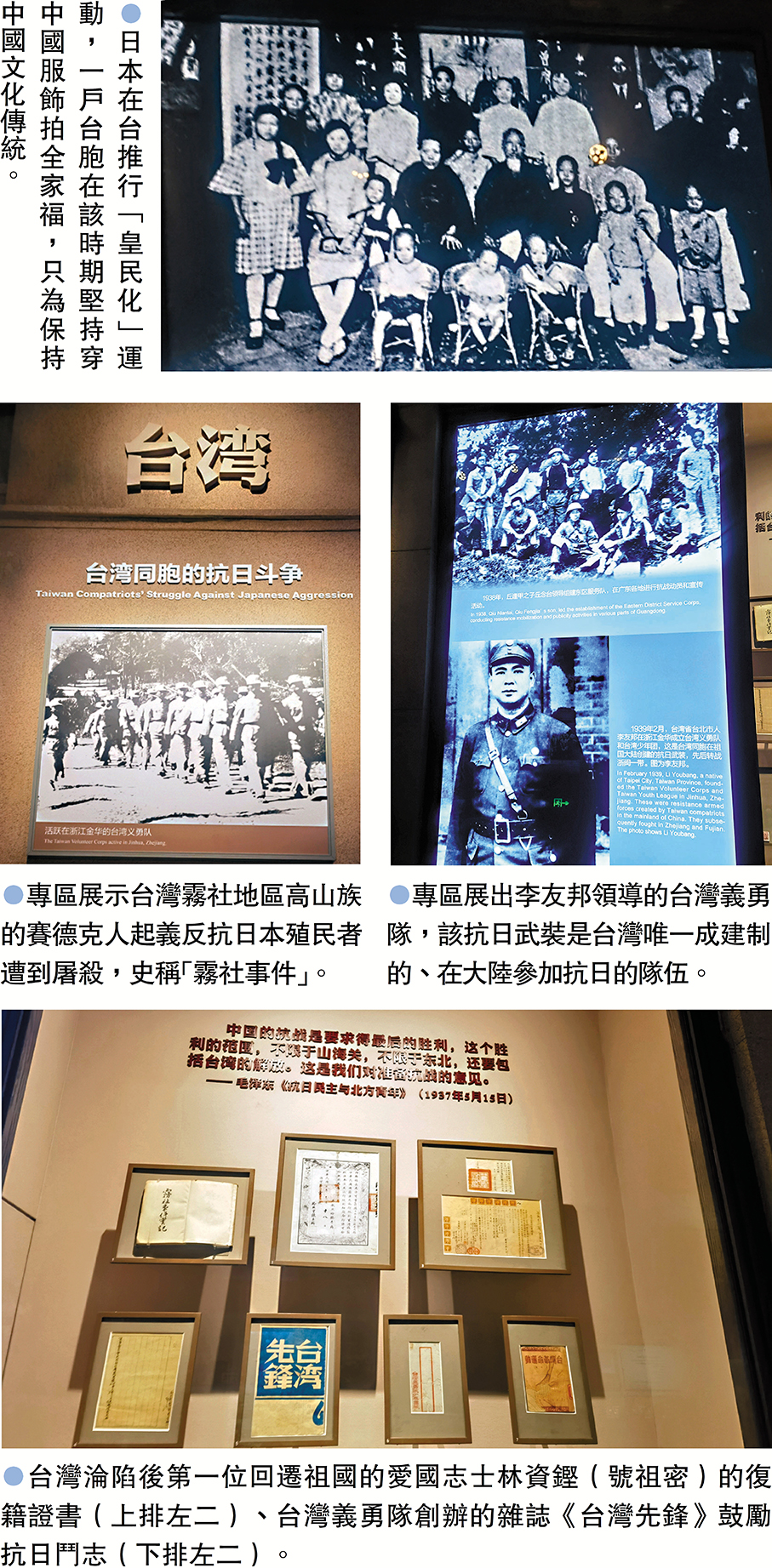 日本在台灣不僅實行總督制專制統治,還蓄意加強思想控制,推行「皇民化」運動,其中包括日常生活的日本化,受到台灣人民抵制。一張穿着中國傳統服飾拍攝全家福的合影,顯示民族危亡之際,熱愛祖國的台灣同胞抗拒日本殖民者的強制同化、保持自身的民族性。此外,國民黨前主席連戰的祖父——著名史學家連橫的書作《台灣通史》也備受關注。在長達數十年的日據時期,當看到殖民者為了泯滅台灣人民的民族意識,竭力棄毀台灣的歷史文獻,有意偽造虛假的歷史愚弄當地民眾,連橫秉持「國可滅而史不可滅」的古訓,懷着「生根台灣,心懷大陸」的愛國情懷,歷經10餘年撰寫了60萬餘言的《台灣通史》,寄託其體現兩岸一脈相傳、維護中華民族精神的畢生心志。