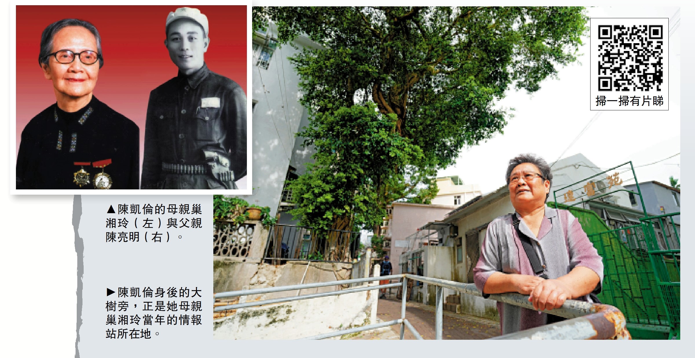 走在長洲錯綜複雜的小巷裏,陳凱倫健步如飛,突然在一顆大樹旁停下,神秘地說:「這棵樹旁邊就是母親的情報站,雖然老房拆了,但她認得這棵樹。」陳凱倫又指了指左邊30米處的紅色建築:「那邊就是日軍的司令部。你知道為什麼要將情報站設置到司令部的旁邊嗎?」「我媽說,最危險的地方就是最安全的地方!」她爽朗地笑着,正午的陽光透過樹蔭照在她身上,三五遊客吃着雪糕吵鬧着經過。