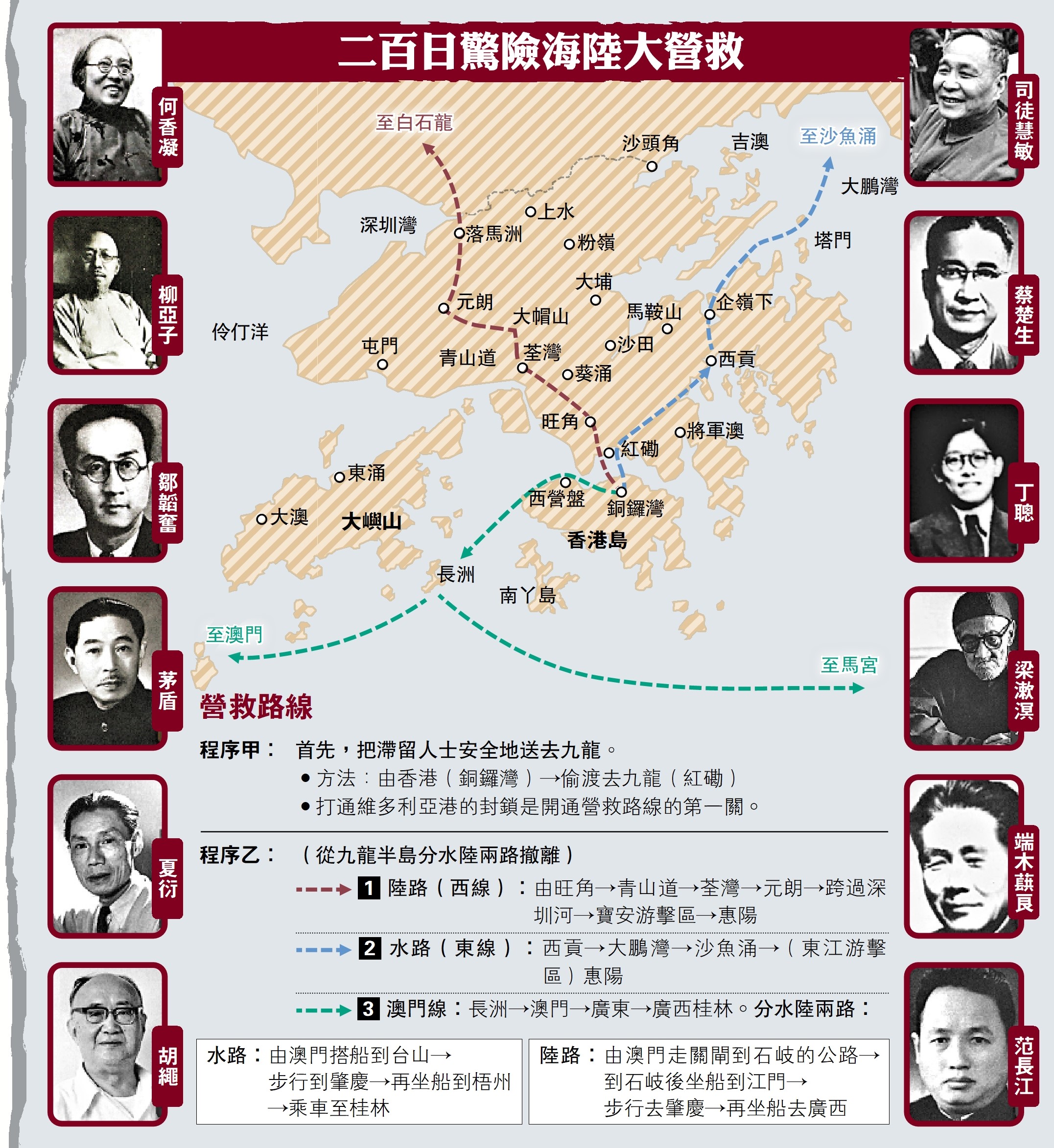 一場由中共地下組織主導的秘密大營救隨即展開,東線由九龍經牛池灣、九龍坳,轉往西貢一帶乘船渡過大鵬灣,再進入惠陽游擊區;西線則由九龍出發,經大帽山至元朗、落馬洲,再越過深圳河與梅林坳,抵達白石龍游擊根據地。新界楊家村的「適廬」曾作為西線的重要中轉站,作家茅盾與新聞人鄒韜奮均曾在此藏身。