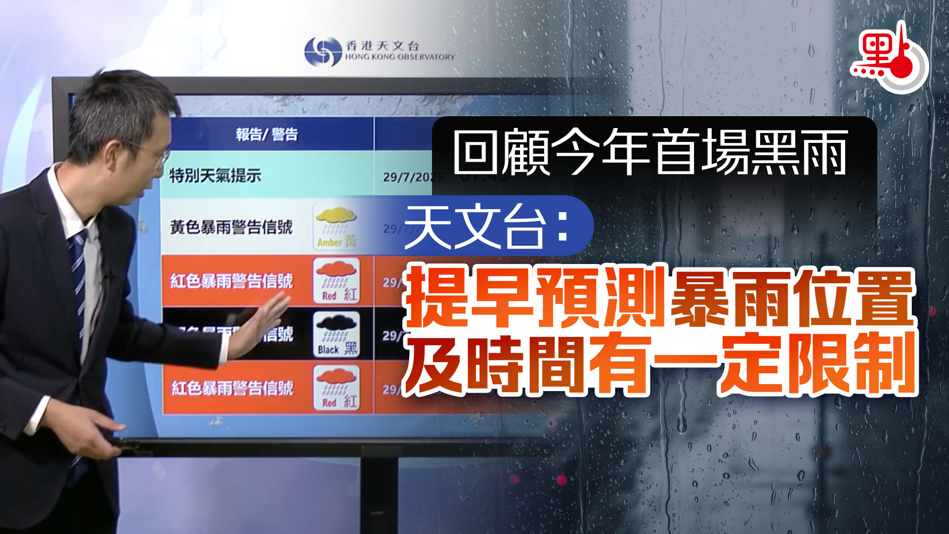 而事實上,水浸嚴重程度亦與預警時機密切相關,若能提早發布,政府與市民均可更充分準備。天文台在社交平台指出,昨早的暴雨發展極快,9時前後雨勢驟增,導致需發出黑雨警告。此次強降雨集中於本港東南部,新界西北雨勢相對較小,反映暴雨的隨機性,以現有科技仍難精準預測其出現時間與位置。林筱魯補充,黑雨比颱風更難提前部署,因其突發性高,缺乏清晰路徑預測,故需依賴日常防洪準備。李世榮則建議,應在多風雨季節建立恒常化的水浸防禦機制。