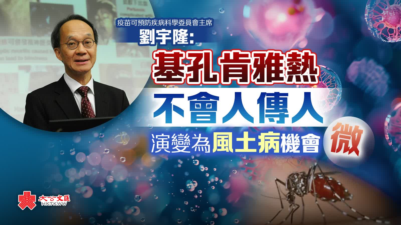 劉宇隆指,基孔肯雅熱不會人傳人,只會透過蚊子傳播,相信演變為本港風土病並大規模爆發的機會不高,建議市民做好防蚊措施。