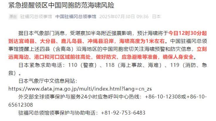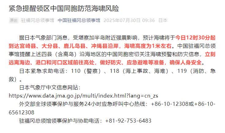 據日本氣象部門消息,受堪察加半島附近強震影響,預計海嘯將於今日12時30分起到達宮崎縣、大分縣、鹿兒島縣、沖繩縣沿岸,海嘯高度為1米左右。中國駐福岡總領事館提醒上述四縣(含離島)沿海地區的中國同胞密切關注海嘯預警和防災信息,立刻遠離海邊、港口和河口區域前往高處,做好防災、應急避難等準備,確保人身安全。