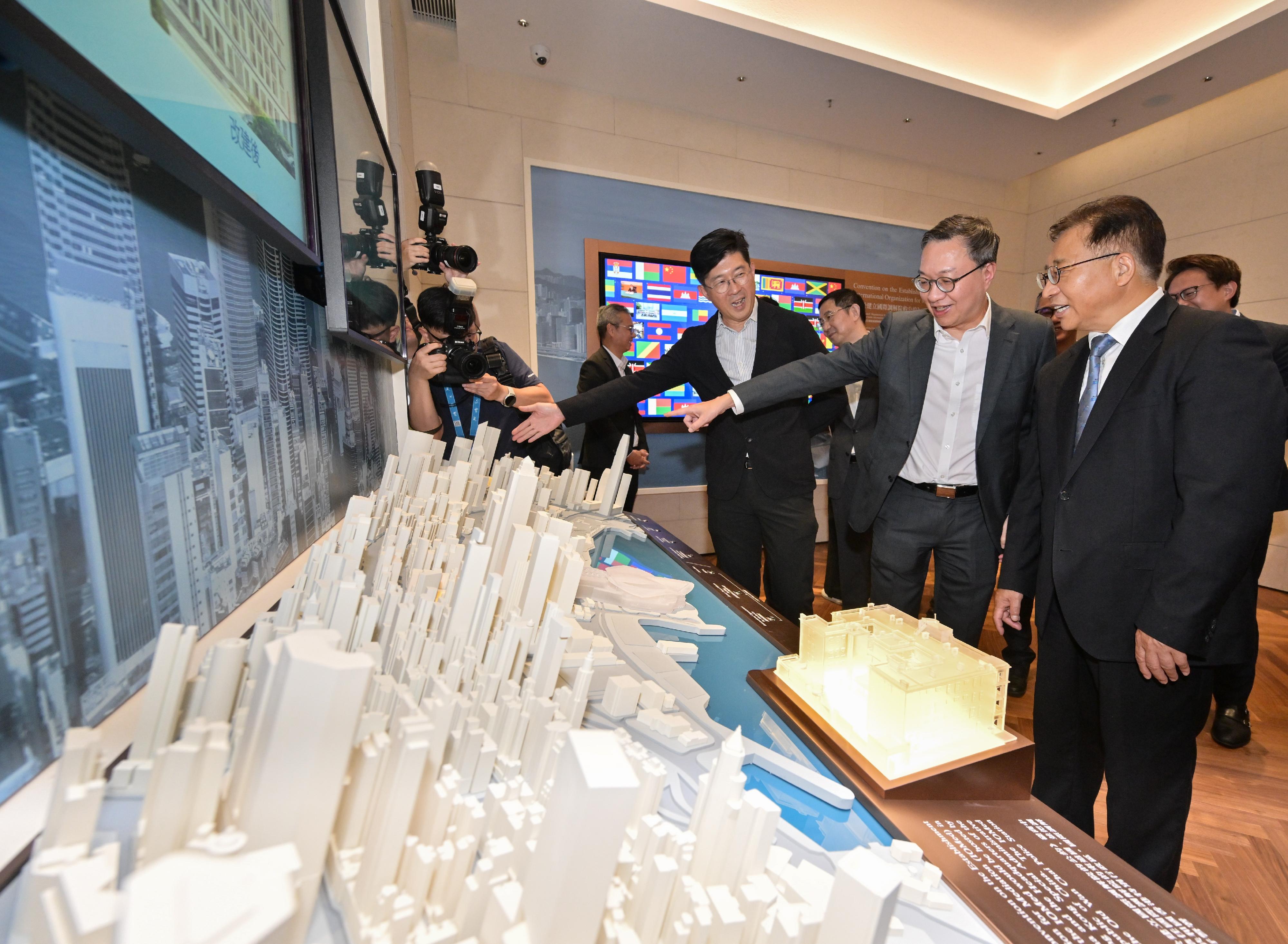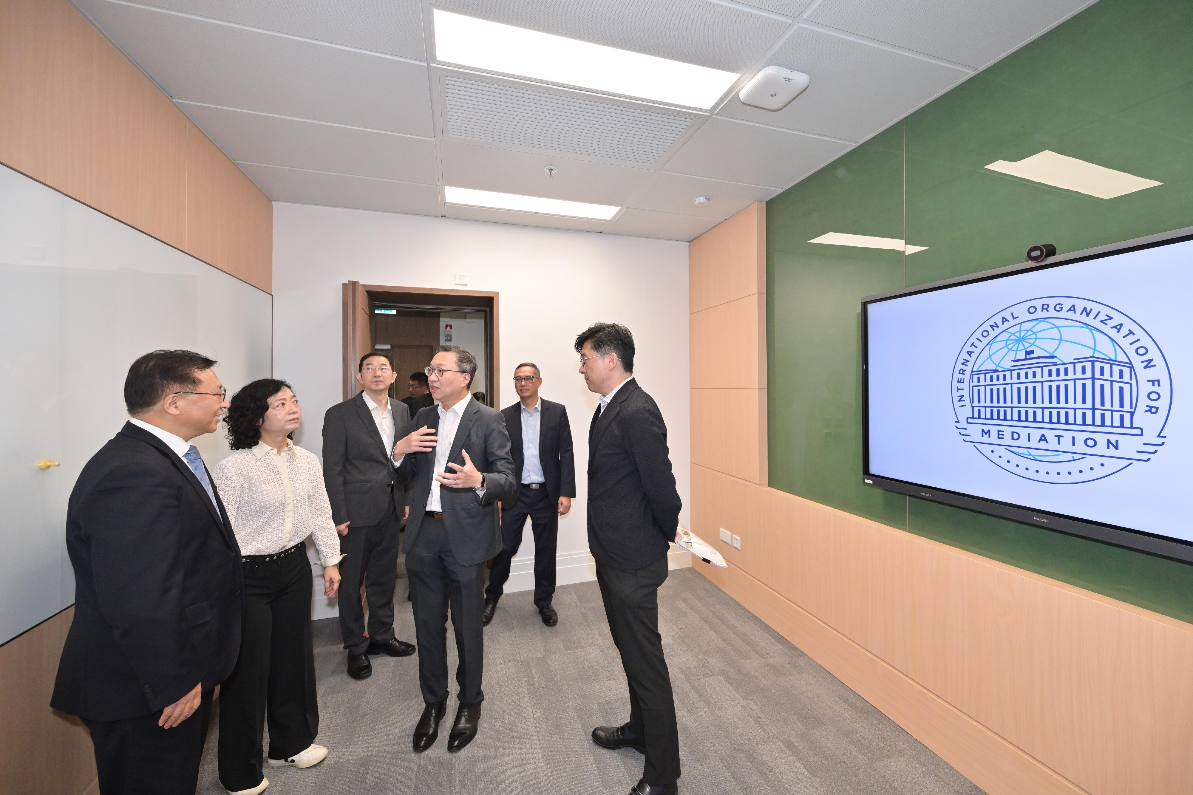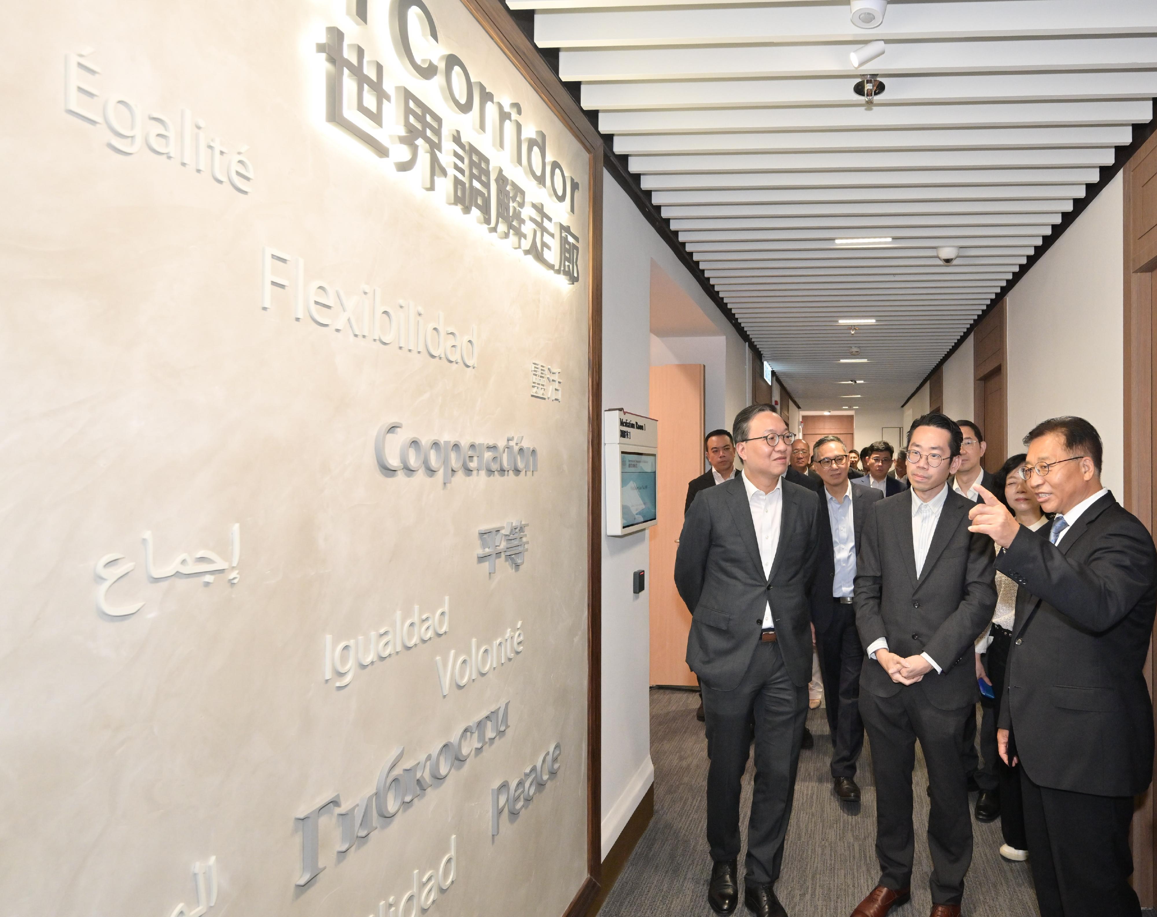 在國際調解院籌備辦公室主任孫勁和發展局常任秘書長(工務)劉俊傑的陪同下,林定國和崔建春參觀國際調解院總部大樓的主大堂、會議廳、調解室和展覽區等,並聽取建築署署長李翹彥介紹大樓的活化過程和各項設施。