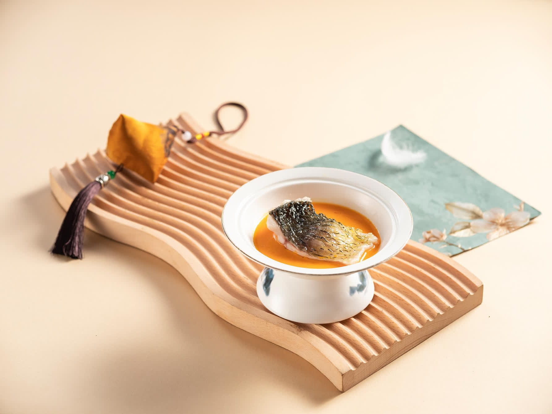 以宴為帛,織就千年匠心:當香雲紗「三蒸」化作疍家雞三吊高湯的韌勁,當「十八曬」沁入鮑汁煨魚肚的琥珀光暈,非遺的基因便滲入食材肌理——鹽焗奄仔蟹橙紅的硬殼,複刻薯莨染池初凝的原漿;鳳脂蒸黃腳立魚肉的綢光,流淌著香雲紗「軟黃金」的質感;勺尖劃過薯莨慕斯拉出絲綢細痕;蒜香手工粉疊出曬莨場的竹竿褶皺......餐桌就此化作流動的染紡。刀叉起落間,食客用唇齒丈量三十道工序的溫度,於杯盞交錯中接續千年匠心。