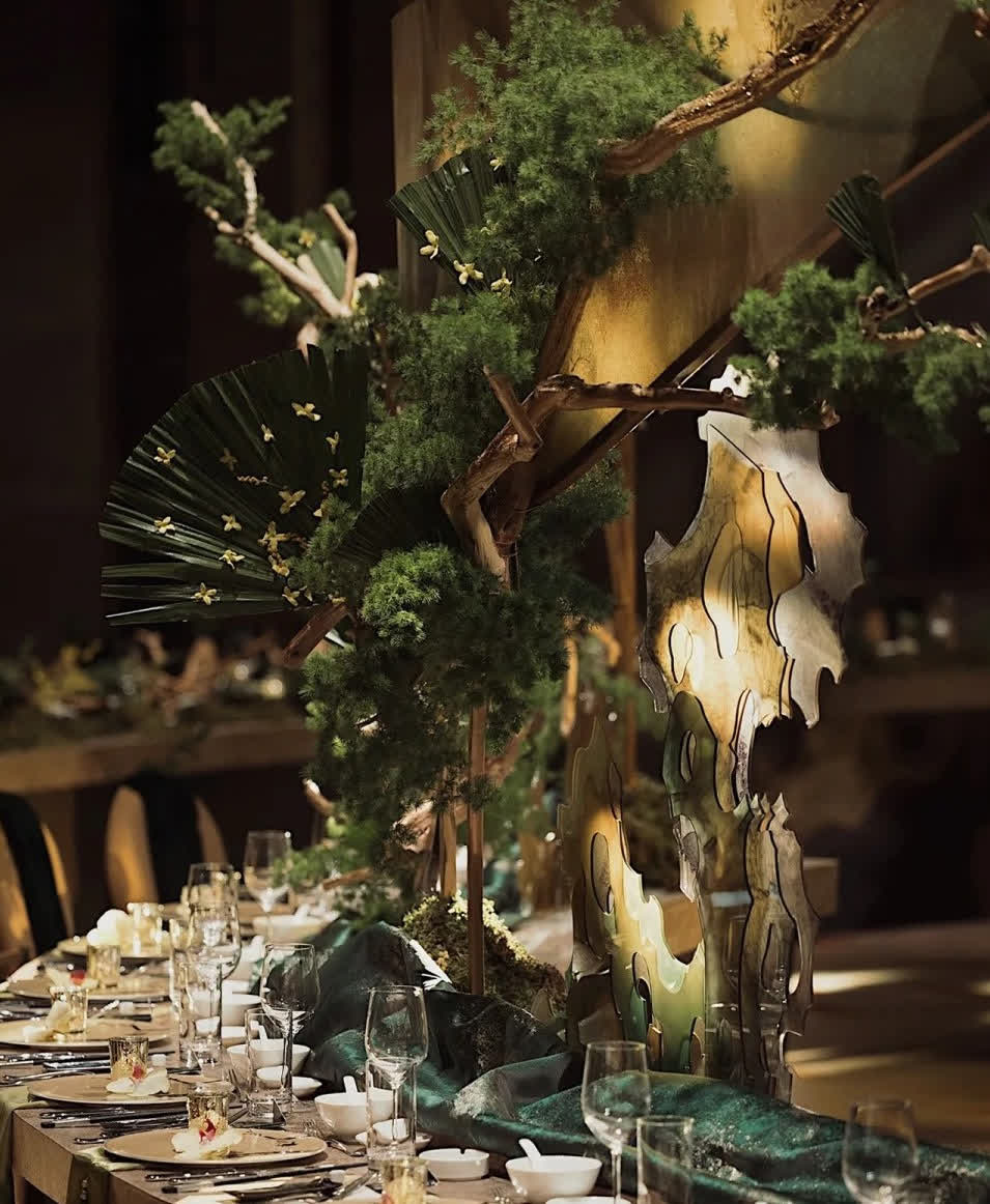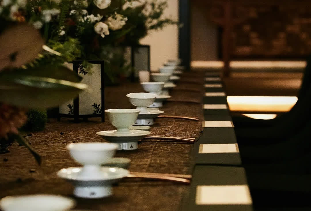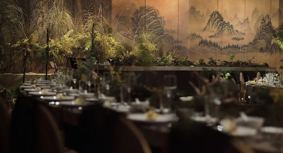 為了達成空間敘事、五感體驗與文化閉環三重維度,宴會廳以香雲紗特有的「莨紗咖色」為底色,暈染嶺南水鄉的青綠。設置角落迷你染坊重現「過河泥」工藝,莨紗與陽光、泥土反應的色彩變化,讓用餐者「未食其味,先識其色」,同時實現「品美食、觀非遺」的沉浸體驗。