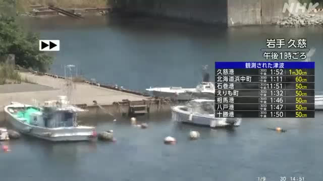 日本氣象廳公布,當地時間13時52分,岩手縣慈久市慈久港觀測到高度為1.3米的海嘯,並提醒第一波海嘯過後可能會有更高的海嘯來襲,呼籲沿海與河流沿岸的民眾立即疏散到高處。NHK公布一段延時短片記錄岩手縣久慈港下午約1時左右的水位變化,可見潮水急速漲落,現時已幾乎淹沒碼頭。報道稱,潮水急劇上漲可能會造成洪災。