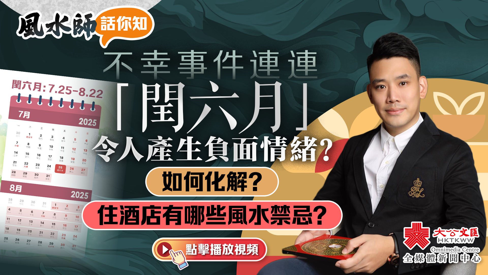 大公文匯全媒體報道,剛過去的周末,香港接連發生幾起不幸事件,涉及多起命案。網上討論頗多,說往年現在已經進入農曆七月,今年7月25日進入的卻是「雙春閏六月」,所以有點「邪」。究竟什麼是「閏六月」?「閏六月」有哪些禁忌?旅遊住酒店有哪些風水上的注意事項,大公文匯全媒體特別請來風水命理師傅周璞初,為大家一一解答,即刻去片!