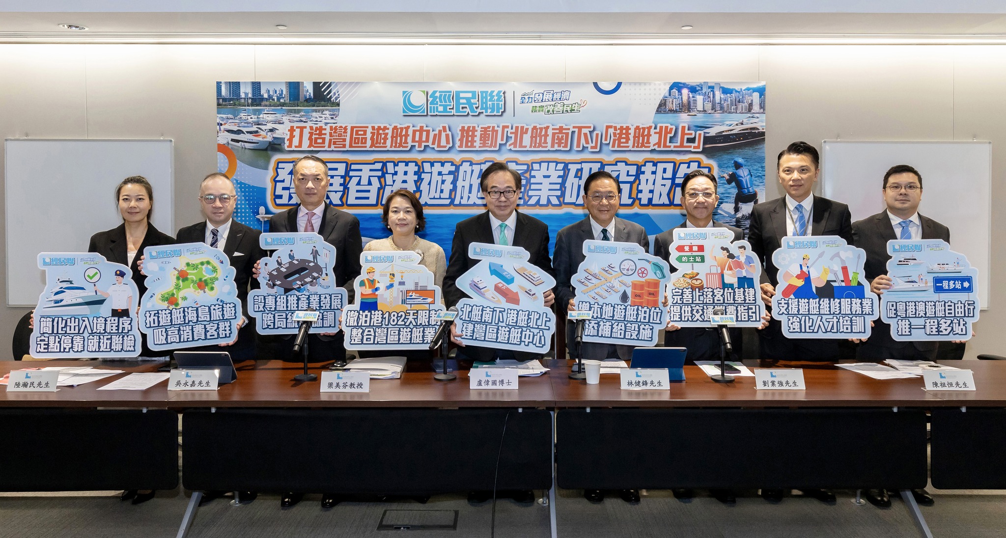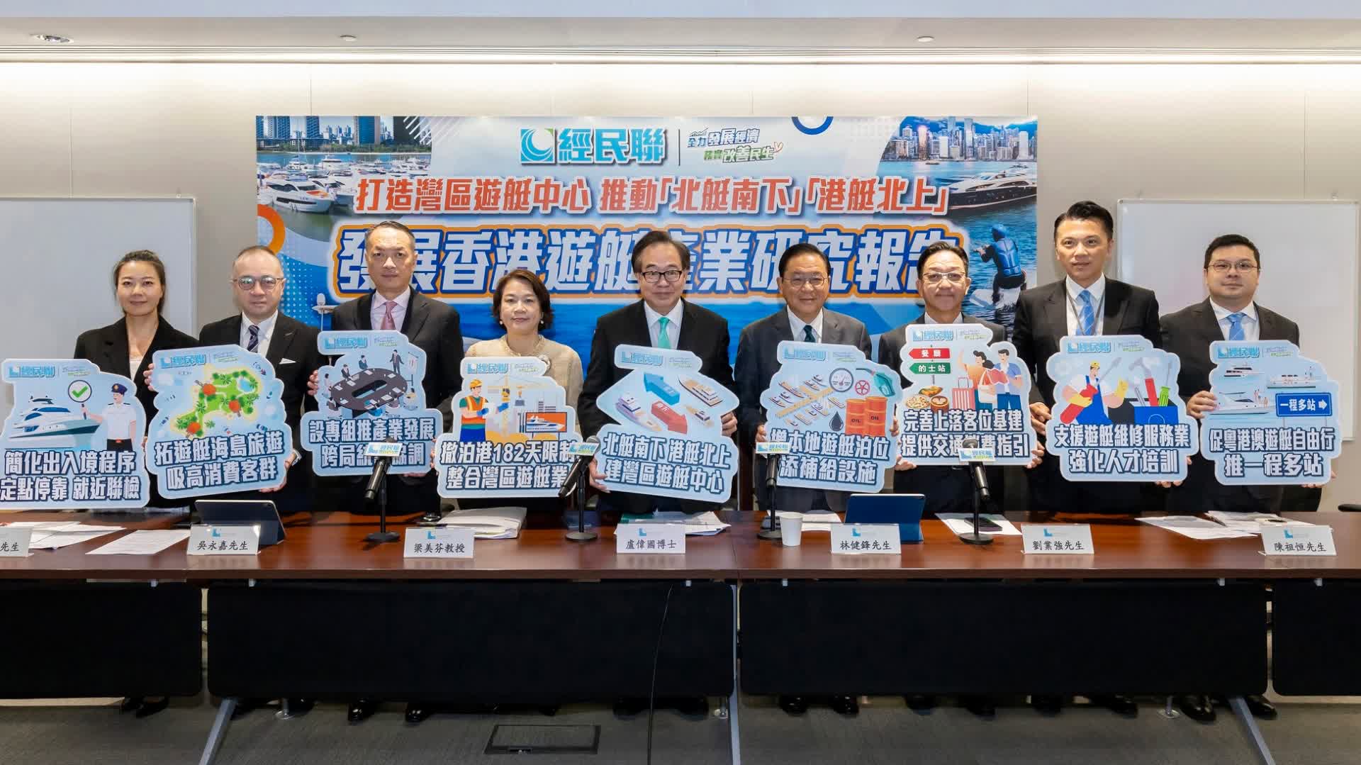經民聯在發展香港遊艇產業報告中提出的七大建議包括:大力推進「北艇南下」和「港艇北上」,逐步創造條件實現灣區遊艇「自由行」;簡化遊艇的出入境程序和對船員要求,實施「定點停靠,就近聯檢」安排,容許遊艇完成入境手續後均可自由航行;開拓更多遊艇旅遊熱點,全方位增加本地遊艇泊位供應;完善遊艇旅客抵港的交通和消費安排,加強周邊道路網和公共交通服務;制訂明確的本地遊艇旅遊產業和配套政策,成立跨部門專責小組,完善遊艇旅遊發展的跨局統籌和協調工作;支援本地遊艇維修和服務業發展,強化人才培訓,強化與灣區其他城市的優勢互補;加大力度發展遊艇海島旅遊,改善鄉郊地區遊艇基建,推出新一輪「改善碼頭計劃」及增設「興建碼頭計劃」。