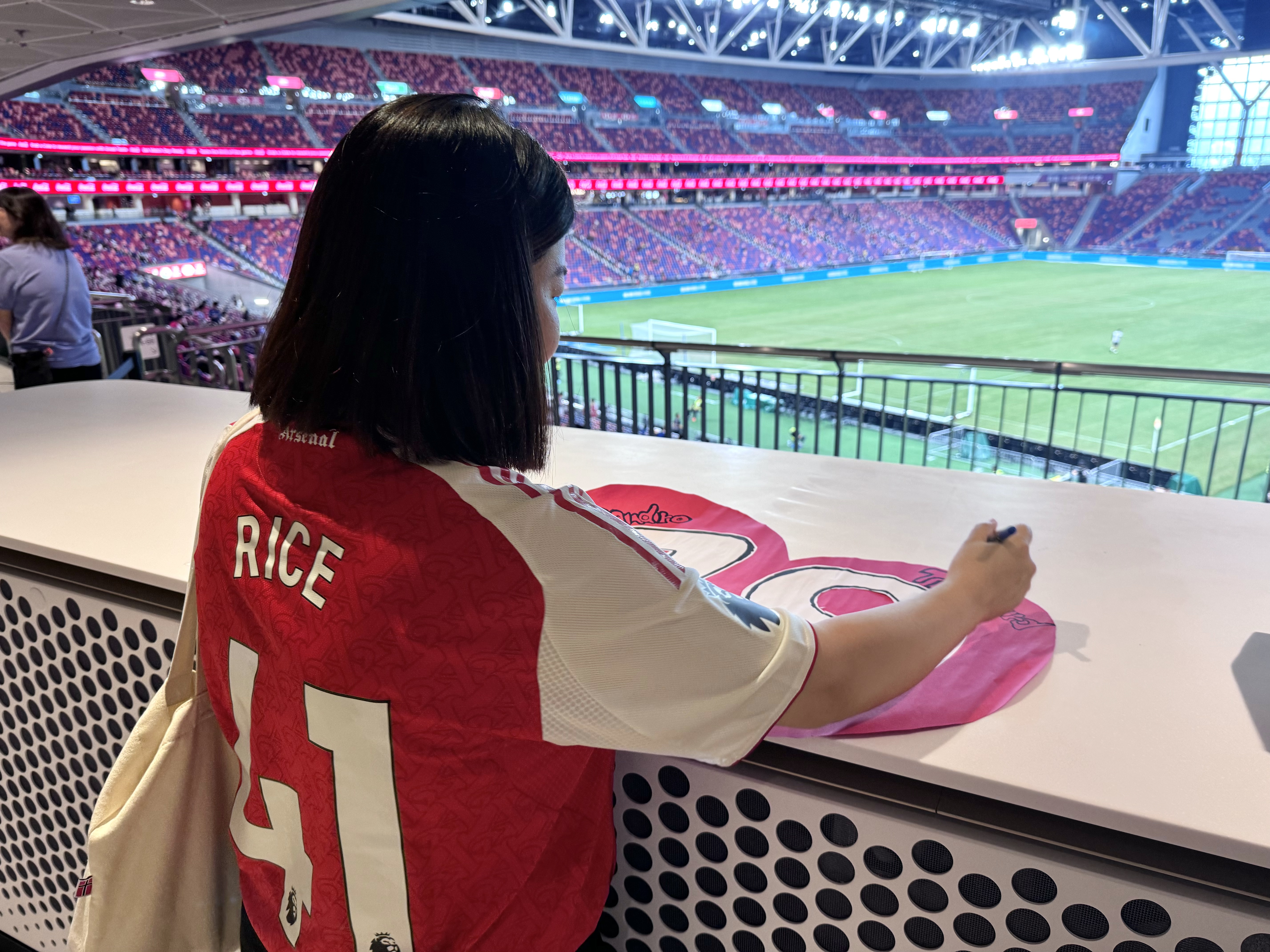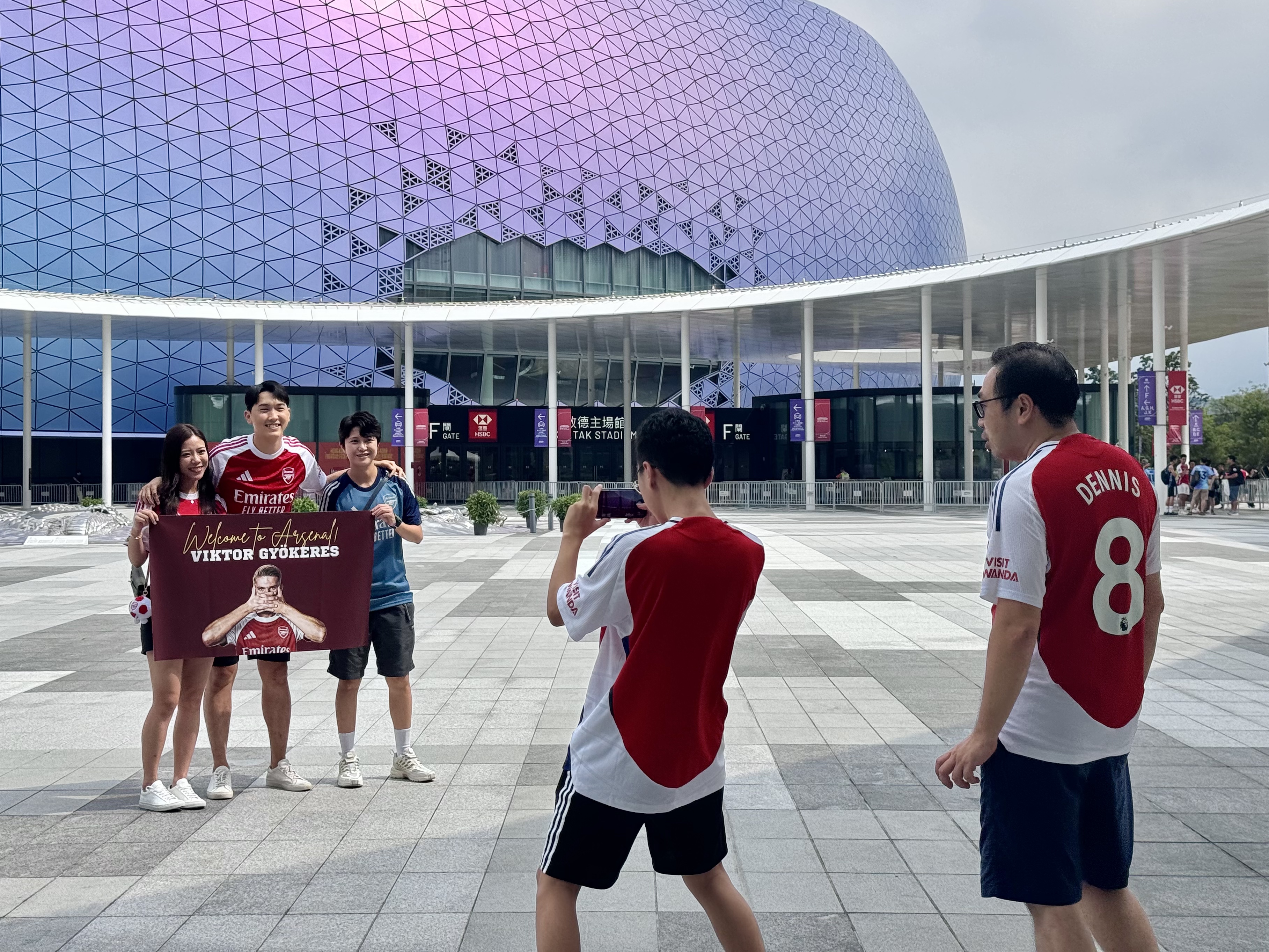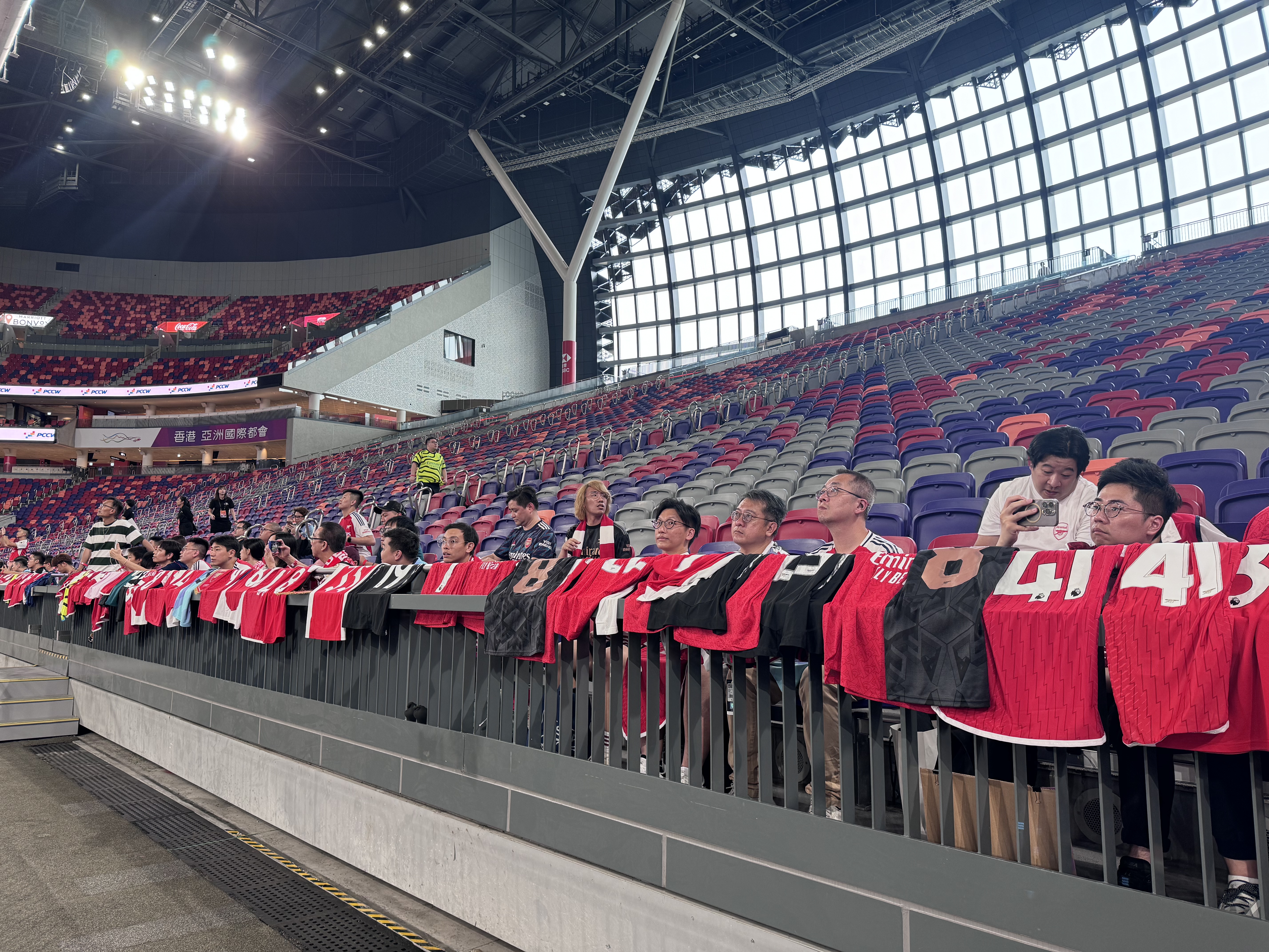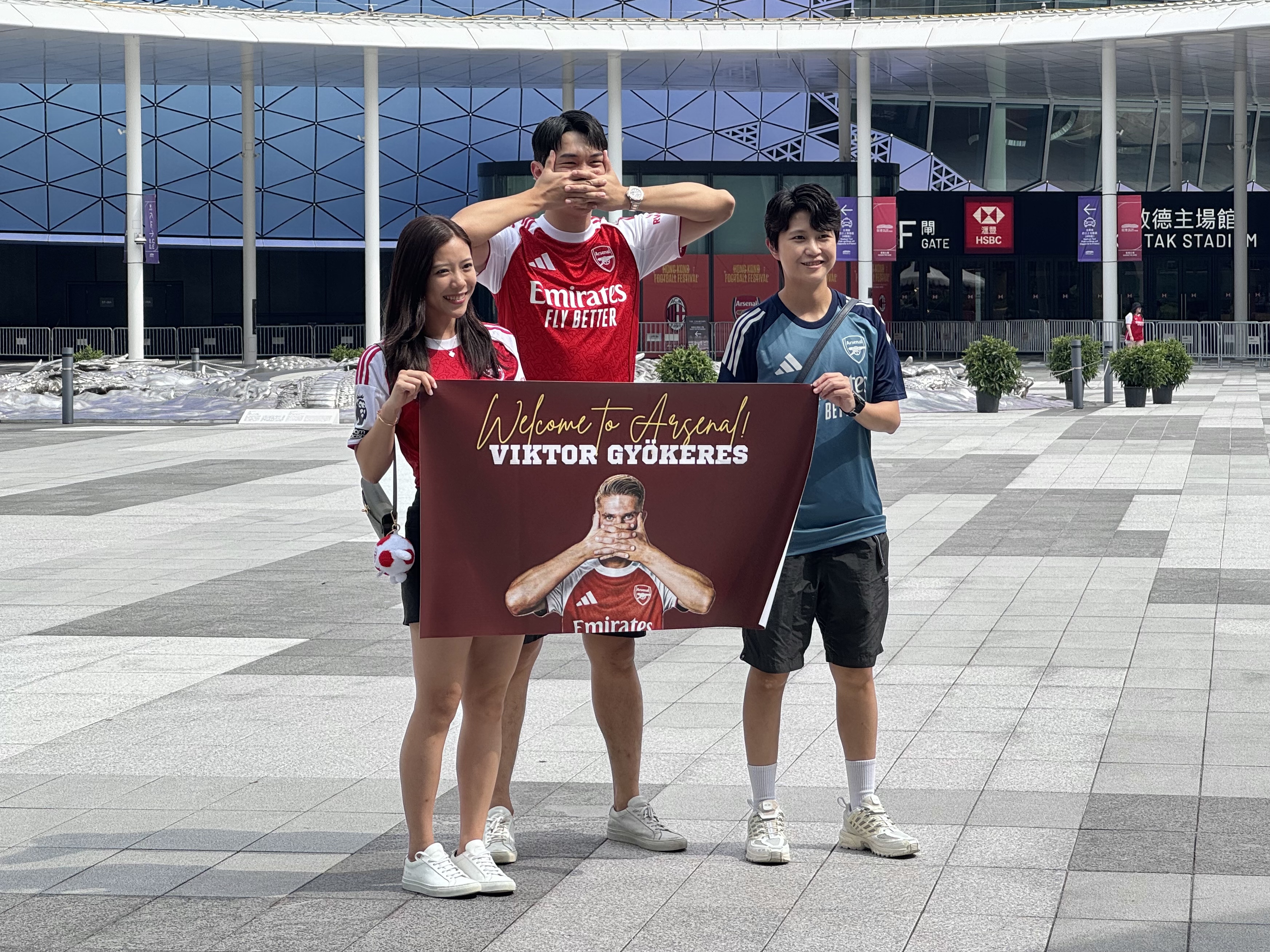 首次來啟德看比賽的朱先生表示,自己支持阿仙奴球隊十多年了,這也是他首次親眼看到愛隊,此時心情很興奮、很感動,不過遺憾的是未能搶到明天正式比賽的門票。他的同伴還正在手寫應援牌,「希望喜歡的球員能夠看到粉絲對他的熱愛和支持。」