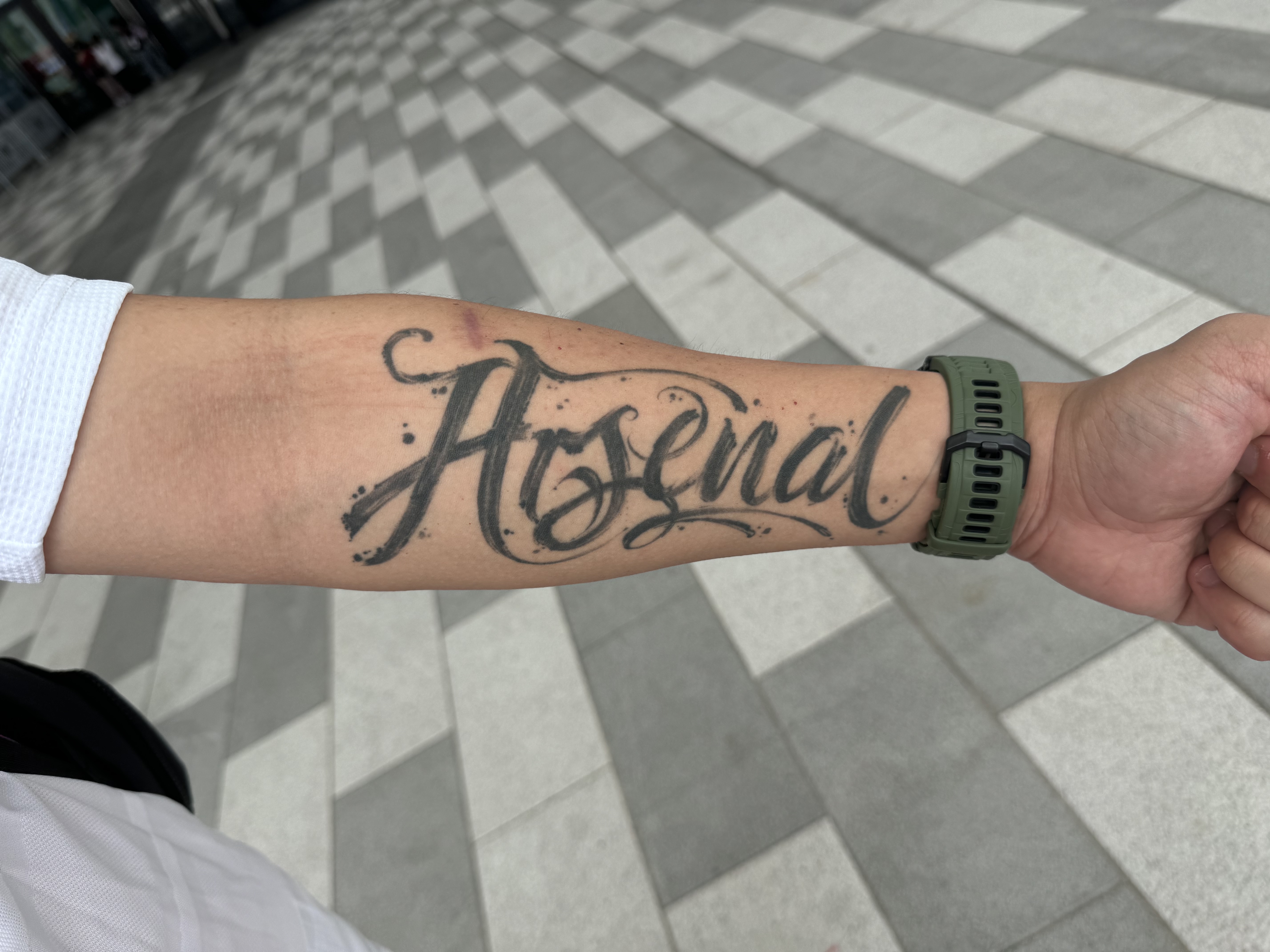黃先生表示,自己早時也搶到了明天比賽的門票,「為此也準備了許多球員的卡片,希望有機會能夠獲得簽名和合照。」他還向記者展示了自己手上的紋身,正是阿仙奴球隊的名字。