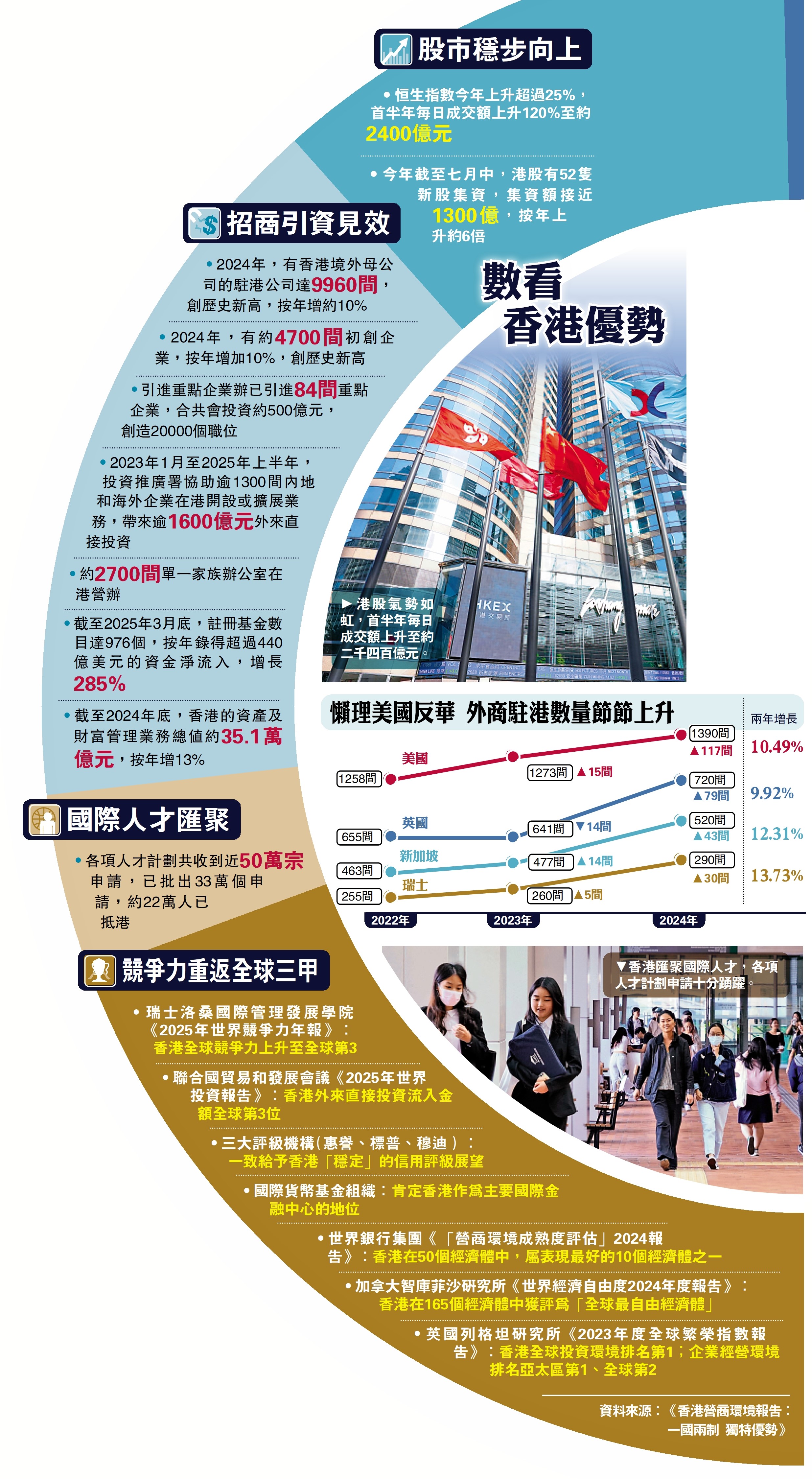 (大公報 記者 曾敏捷)特區政府昨日發表《香港營商環境報告:一國兩制 獨特優勢》,介紹香港的最新發展和優勢。報告指出,本港近年在招商引資、吸納人才等方面成績亮麗。在關稅戰衝擊下,外商懶理美國反華,駐港公司數量上升一成,總數近萬間;初創企業數目接近4700間,兩者均創新高;「高才通」等輸入人才計劃,共吸引50萬宗申請;股市今年節節上升,恒生指數累計上升逾25%。香港競爭力不僅沒有削弱,反而進一步增強。