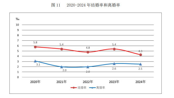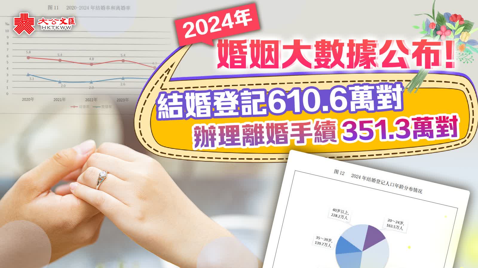 大公文匯網報道,7月30日,民政部公布2024年民政事業發展統計公報,公報顯示,2024年,全國婚姻登記機構和場所共計4190個,其中婚姻登記機構1134個,全年依法辦理結婚登記610.6萬對,結婚率為4.3‰。依法辦理離婚手續351.3萬對,離婚率為2.5‰。