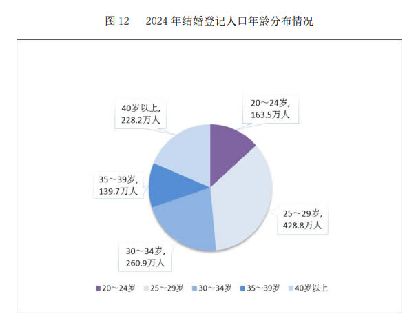 根據公報及相關數據,2024年,我國結婚登記人口中,25-29歲人群佔比最高,共428.8萬人。