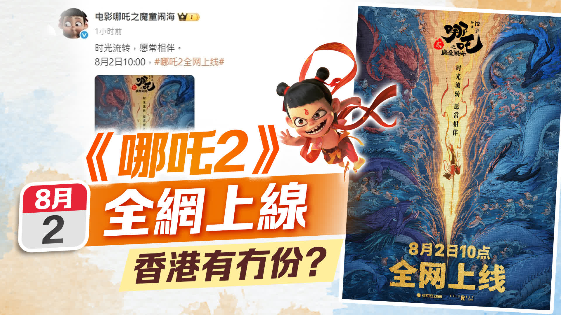 大公文匯全媒體報道,國產動畫電影《哪吒之魔童鬧海》(《哪吒2》)今年初在全球掀起觀影熱潮。官方今日(7月31日)宣布,《哪吒2》將於8月2日上午10時全網上線,屆時將登陸騰訊視頻、愛奇藝、優酷等視頻網站。至於會否在香港地區的流媒體平台上線,大公文匯正向有關方面查詢。