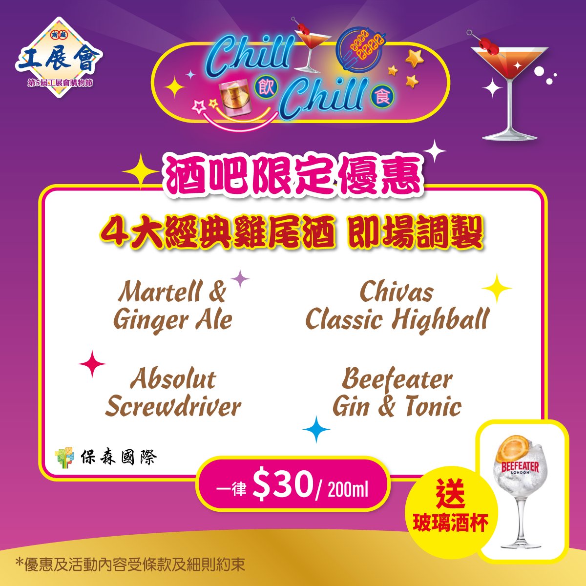 另一個美食區,「Chill飲Chill食區」則打造成仿酒吧空間,人氣Cocktail只需HK$30,有專業調酒師現場為你調製,點單即送玻璃酒杯一隻。還有驚喜福利加碼,每日下午3點後酒吧準時派送免費30杯雞尾酒,送完即止,先到先得。