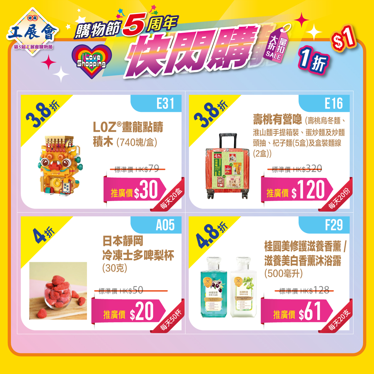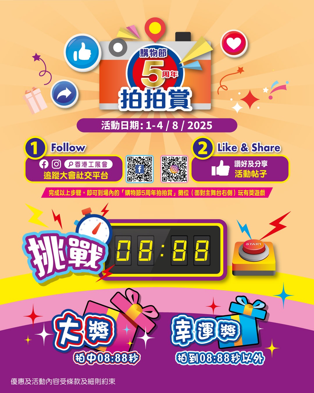- 購物節5周年拍拍賞:一LIKE即賞有獎遊戲!追蹤及讚好工展會社交平台並分享活動帖子,即可到拍拍賞攤位(表演台右側)參與遊戲。拍中8.88秒獲「大獎」,8.88秒以外獲「幸運獎」,人人有獎,永不落空!