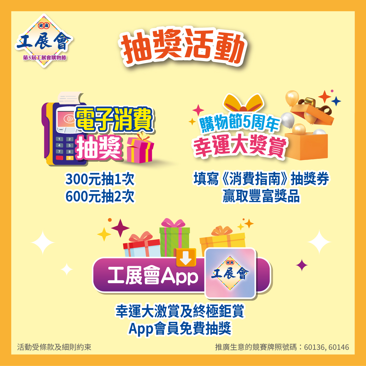 - 幸運大獎賞:毋須消費都可抽大獎!填妥《消費指南》內的「購物節5周年幸運大獎賞─『工展每日幸運賞』及『購物終極幸運賞』抽獎券,放入抽獎箱(表演台座椅後),即有機會贏取名貴家電及保健品等豐富獎品,總值港幣3萬元。