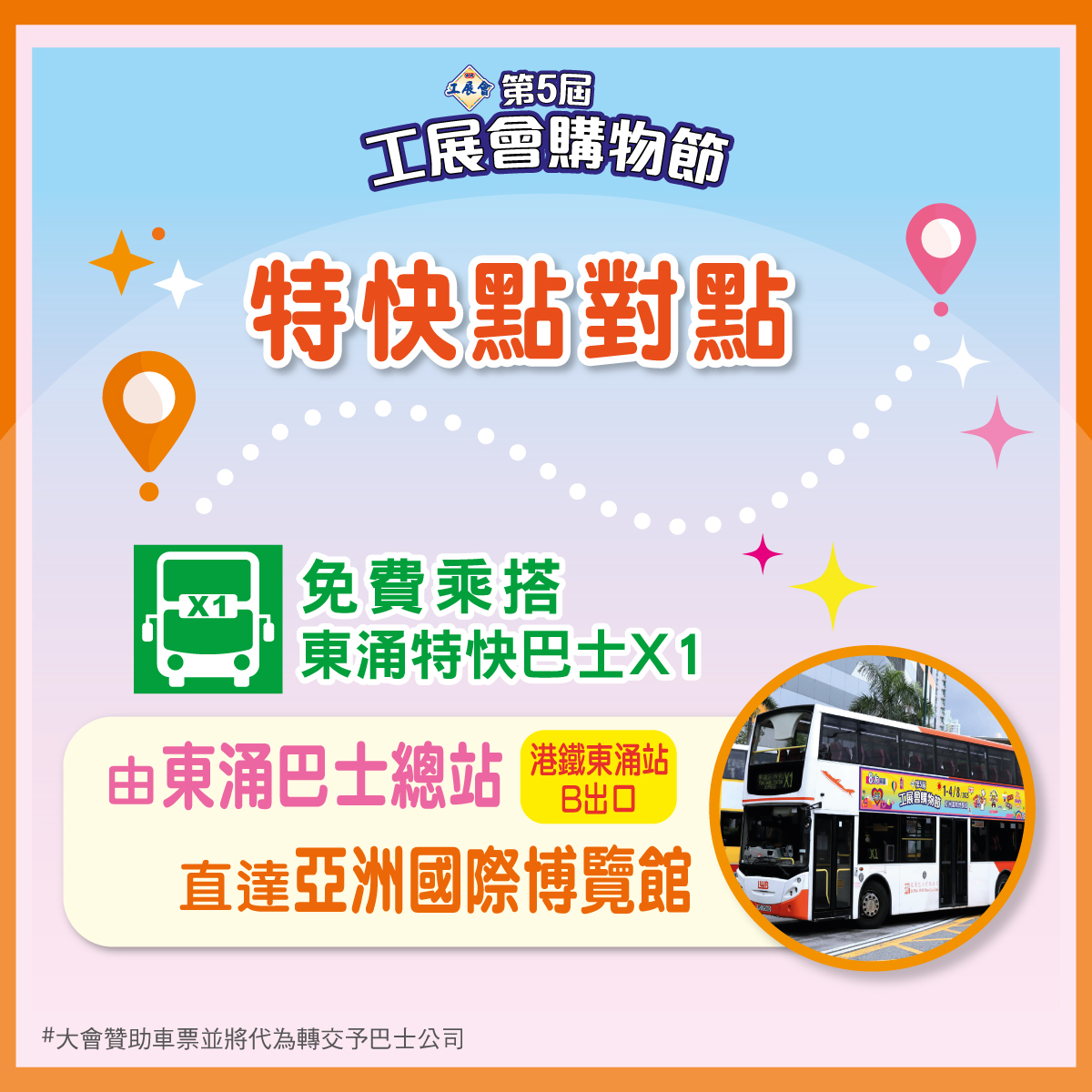 地鐵:乘坐港鐵至「東涌站」B出口,出站後可搭乘免費特快巴士 X1,直達博覽館會場門口。
