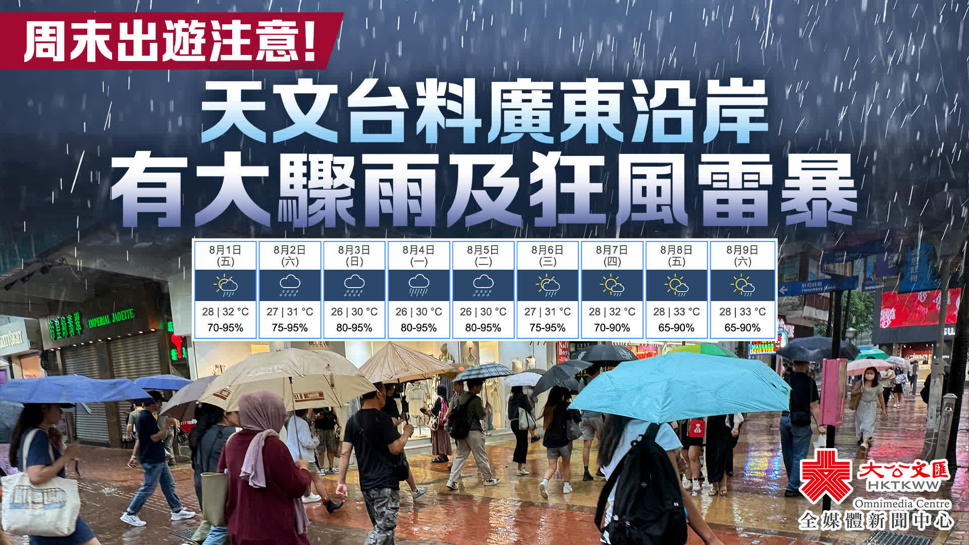 大公文匯全媒體報道,天文台今日(7月31日)表示,一股炎熱的西南氣流會在明日(8月1日)為華南沿岸帶來驟雨及雷暴。隨着西南氣流轉趨活躍及受高空擾動影響,周末至下周初廣東沿岸有大驟雨及狂風雷暴。預料高空反氣旋會在下周中後期覆蓋華南沿岸,該區驟雨逐漸減少,日間天氣酷熱。此外,熱帶氣旋竹節草會在今明兩日橫過華東並逐漸減弱。