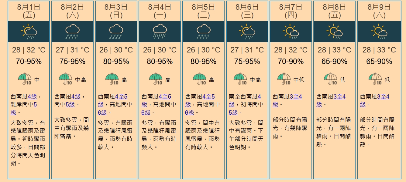 天文台預料本港地區今晚大致多雲,有幾陣驟雨及雷暴。明日初時驟雨較多,日間部分時間天色明朗。氣溫介乎28至32度。吹和緩西南風,離岸風勢間中清勁。展望周末至下周初天氣不穩定,雨勢有時較大及有狂風雷暴。