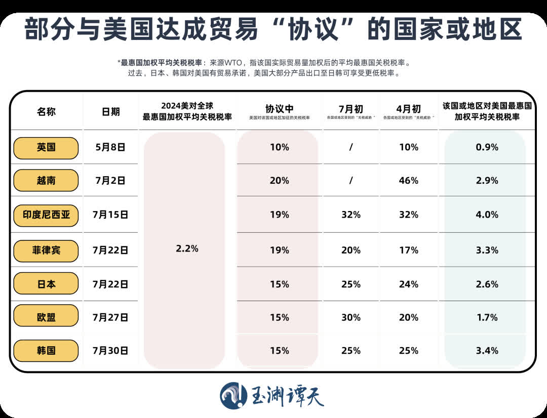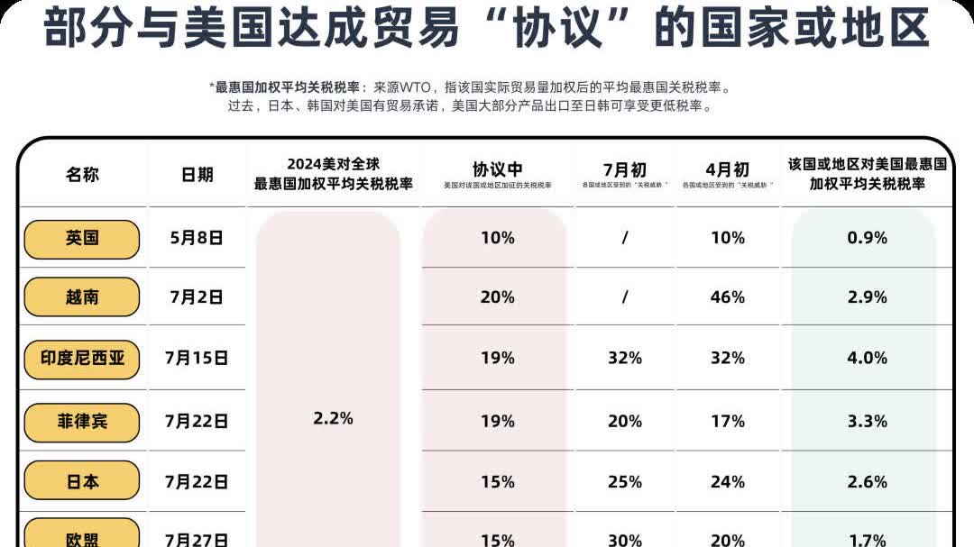 這些達成協議的國家所面臨的關稅,相較於4月2日美國實施的「對等關稅」,確實是降下來了。但如果跟今年以前的狀態比,還是高了不少。