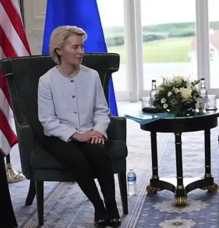 幾天前,美國同歐盟達成貿易協議。與美國宣稱達成史上最大的貿易協議形成反差的,是馮德萊恩雙手放膝的坐姿和緊抿的嘴唇。