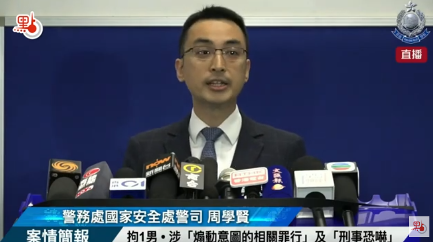 (大公文匯全媒體 記者 陳風)警方今日(8月1日)表示,國安處拘捕一名43歲男子,涉嫌煽動意圖的相關罪行及刑事恐嚇。警方下午召開記者會交代案情。