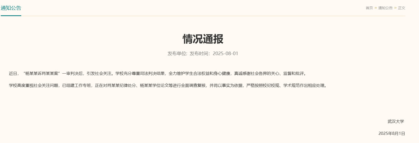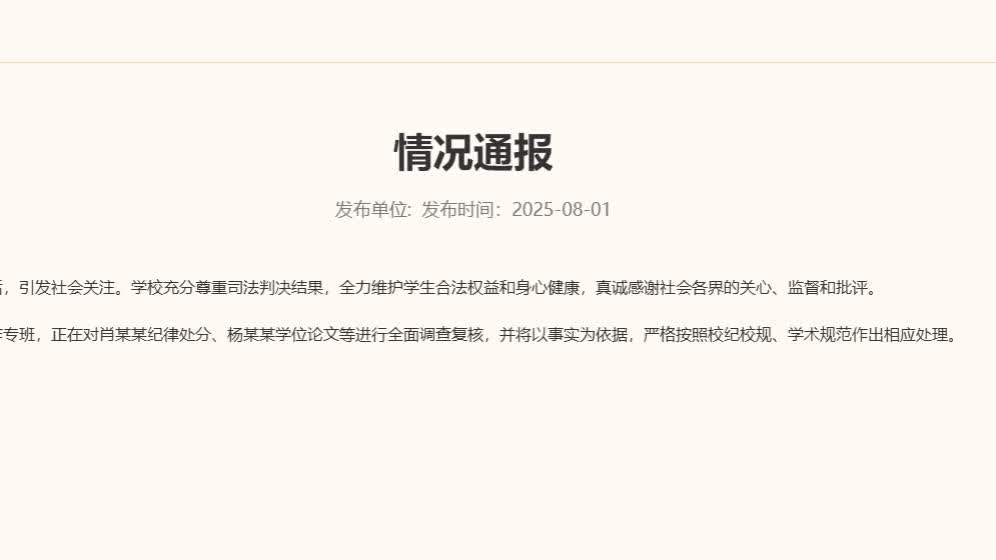 學校高度重視社會關注問題,已組建工作專班,正在對肖某某紀律處分、楊某某學位論文等進行全面調查覆核,並將以事實為依據,嚴格按照校紀校規、學術規範作出相應處理。