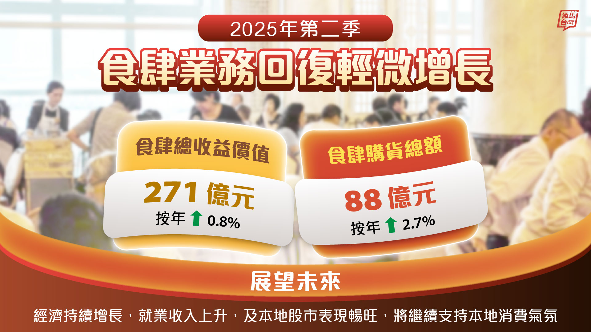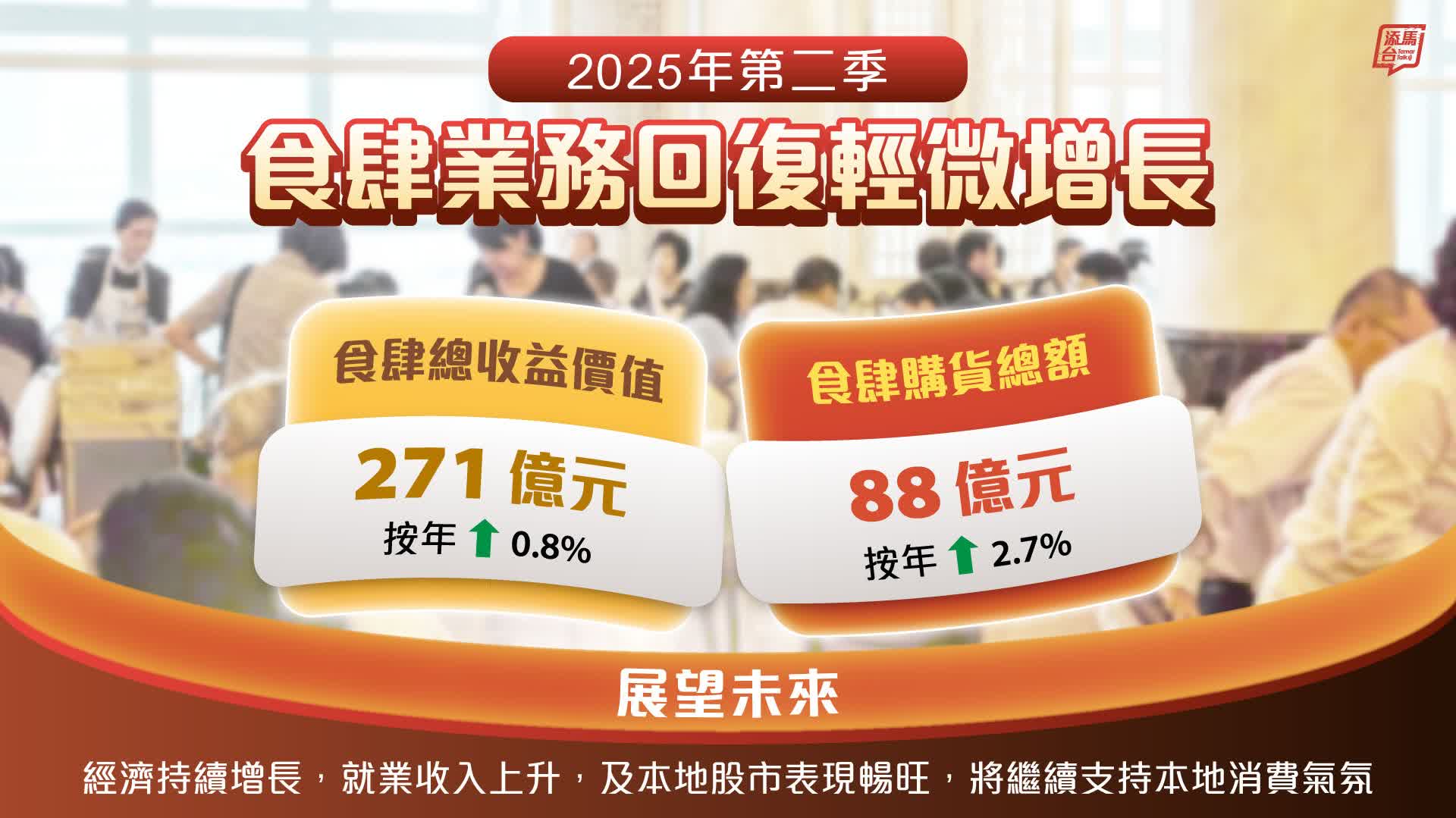 根據今日(8月1日)發表的最新食肆收益及購貨額臨時數字顯示,2025年第二季食肆業務回復輕微增長。食肆總收益價值按年上升 0.8%,經季節性調整後按季上升0.2%。同期間,食肆購貨總額按年上升2.7%。看圖了解更多。
