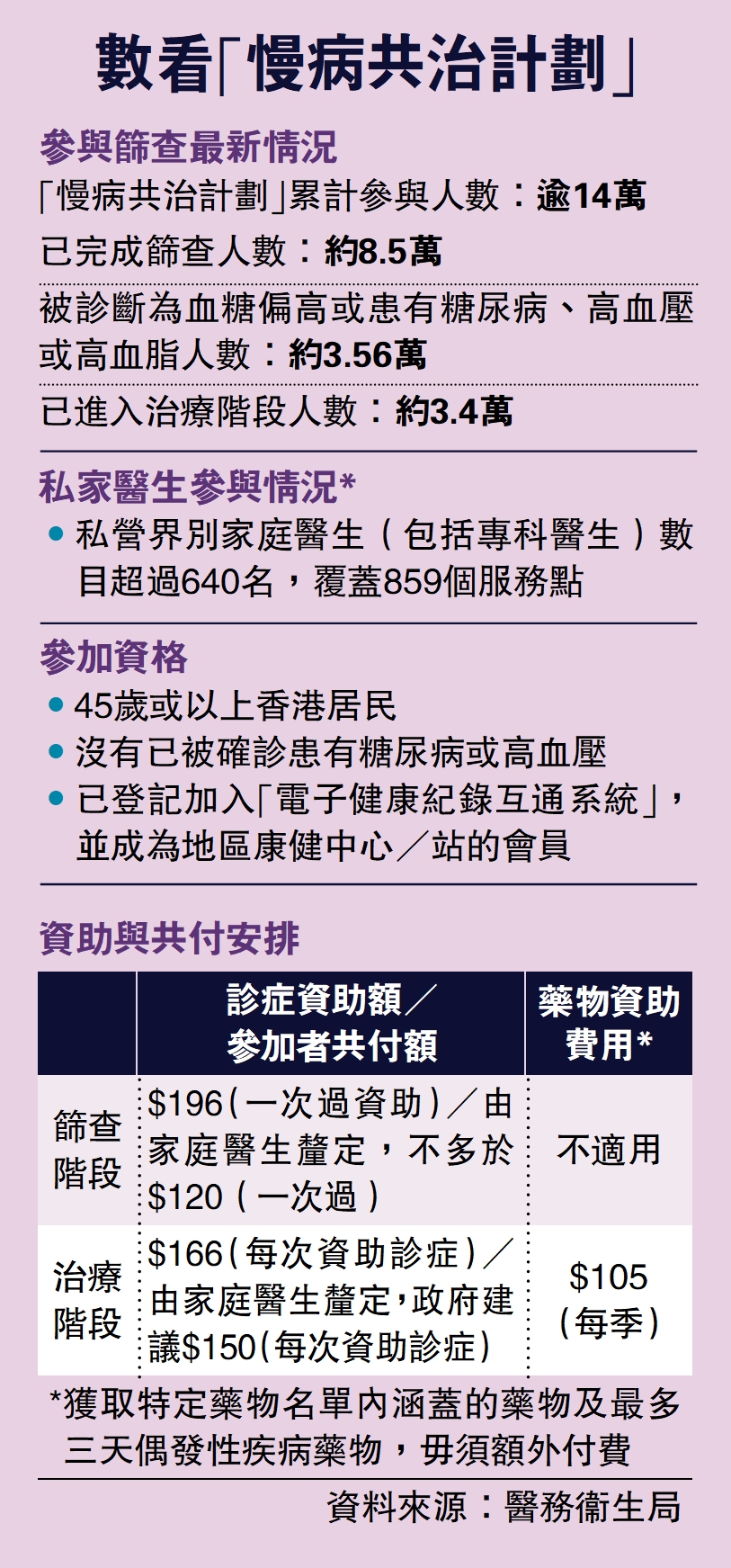 在政府資助下,慢病共治計劃參加者獲處方名單內的藥物,毋須支付藥費。計劃至今有超過14萬人參加,料可較預期提早到達20萬人的目標。截至7月23日,約8.5萬人已完成篩查,其中約3.4萬人被診斷為血糖偏高、患有糖尿病、高血壓或高血脂,並已進入治療階段。