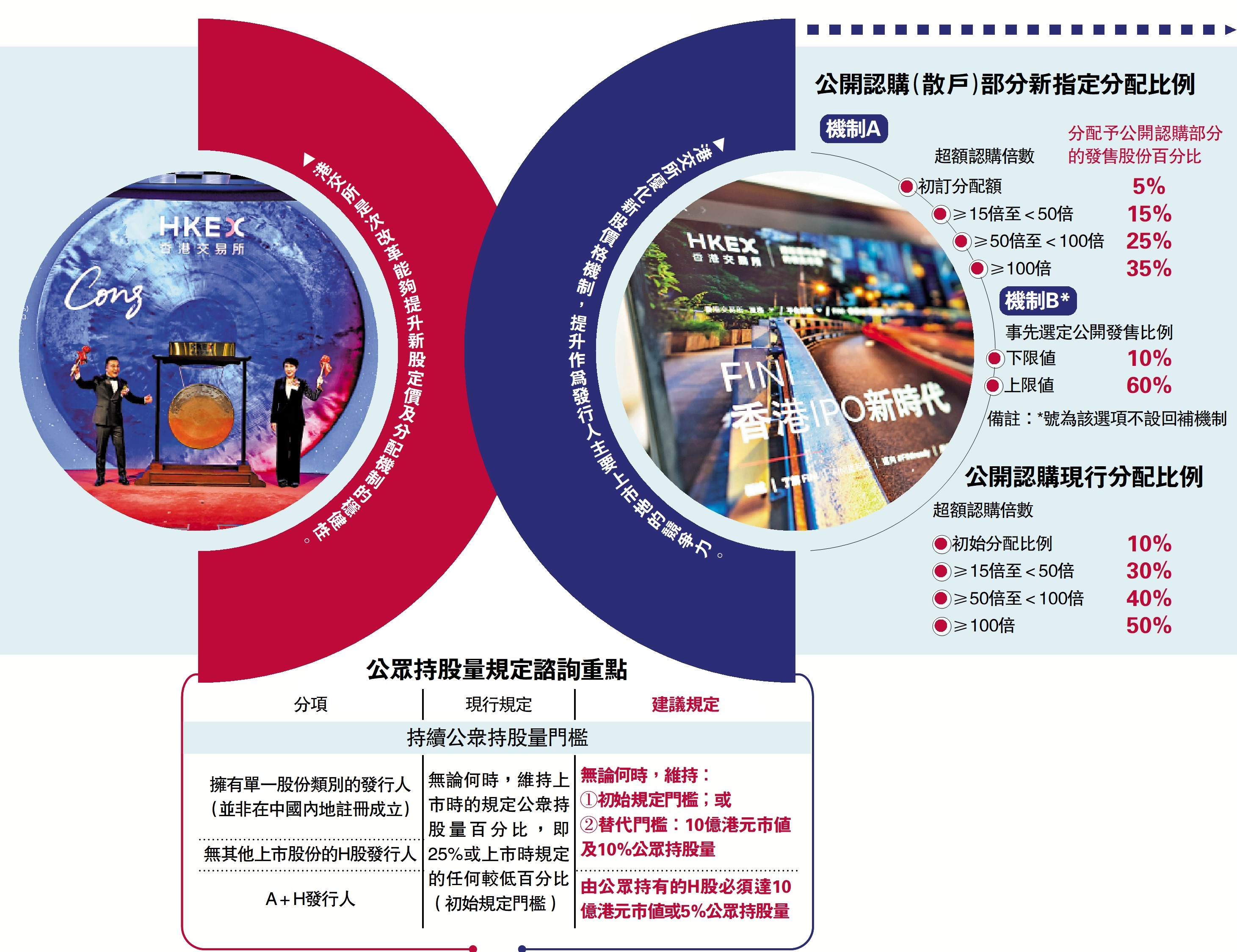 港交所於去年12月就新股市場刊發諮詢文件,最初建議在公開發售部分將回補機制上限由50%大削至20%,引發市場討論。在昨日公布的諮詢總結中,港交所將該上限上調至35%,初始分配份額則維持最初提出的5%,並將其概括為機制A。