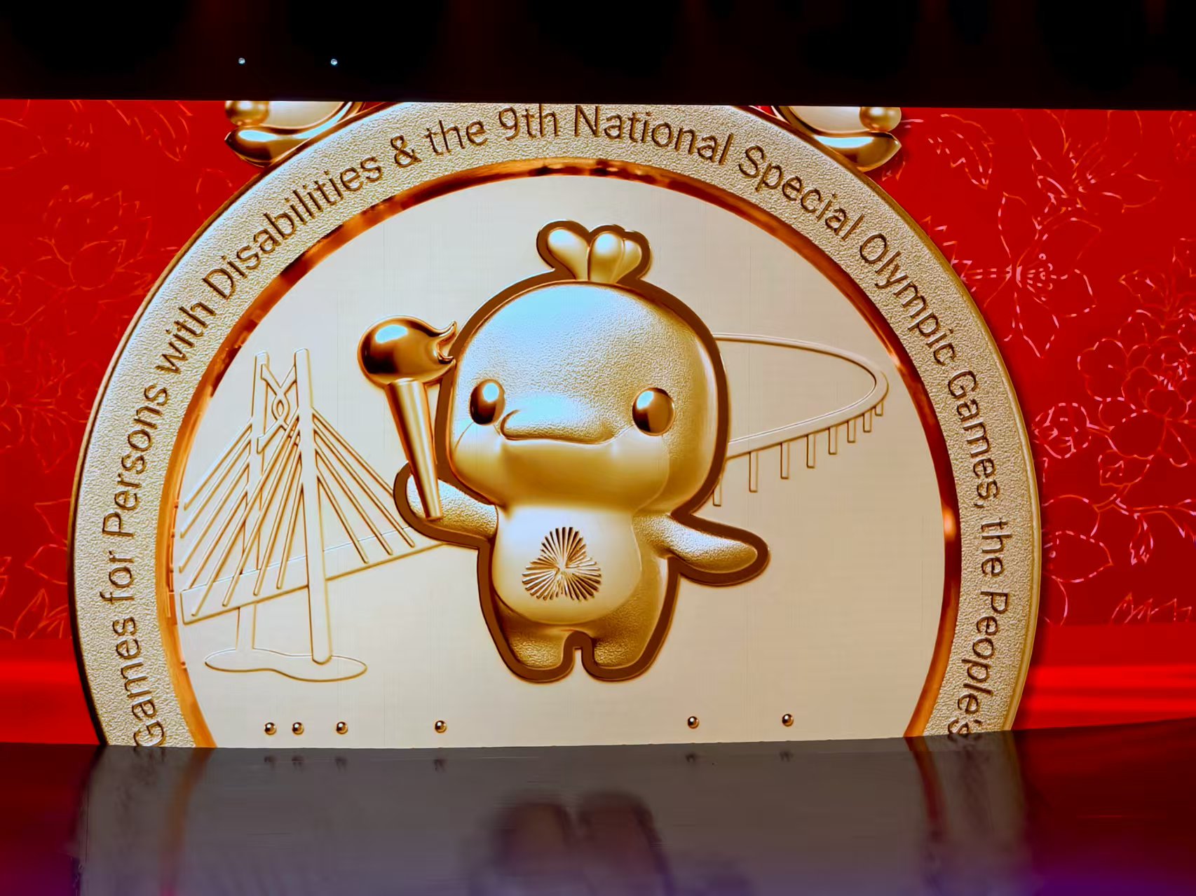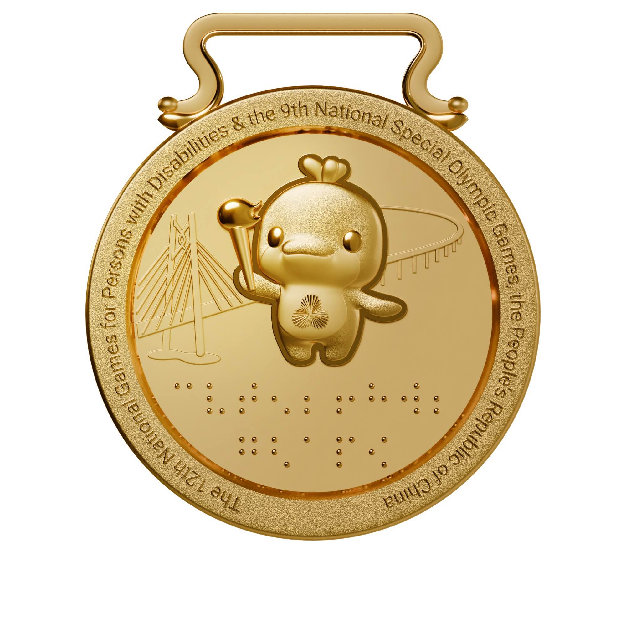 更引人注目的是,浮雕下方創新嵌入盲文,第一行鐫刻「殘特奧會」,第二行分別標註「金牌」「銀牌」「銅牌」,讓視障運動員可通過觸摸感知榮譽,彰顯賽事對特殊群體的細緻關懷。
