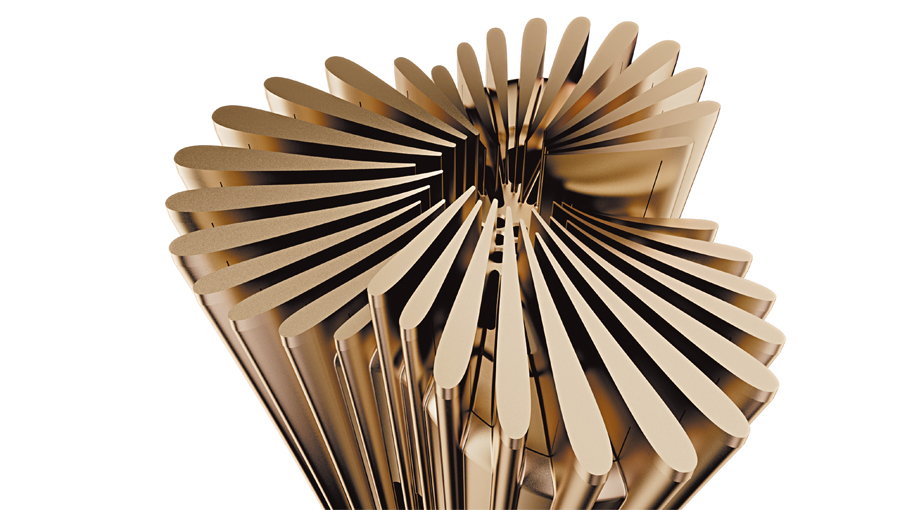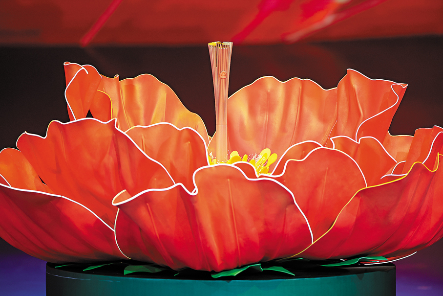 一朵火紅的牡丹花裝置緩緩上台,金黃的花蕊中顯現出此次十五運會和殘特奧會的火炬「綻放」。其以高強度3D打印不銹鋼和耐溫鋁合金為材料,整體呈金色,高760毫米,焰口部位最大尺寸125毫米、把手部位最小直徑52毫米,淨重1.6千克。