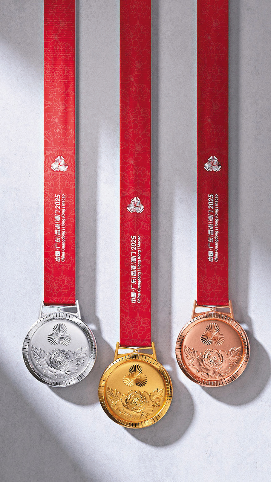 競體項目獎牌會徽面採用「三花映牡丹」概念,延續十五運會會徽中三地禮花的設計語言,代表廣東、香港及澳門三地的木棉、洋紫荊、蓮花花瓣交疊旋轉形成同心禮花,下方的國花牡丹象徵祖國,生動詮釋了粵港澳大灣區在祖國的堅實依託下蓬勃發展,綻放於世界舞台,呈現出「三花映牡丹,盛世綻芳華」的美好景象,獎牌吉祥物面設計均以十五運會吉祥物為主體。