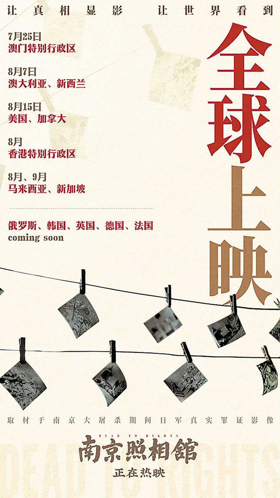 電影《南京照相館》英文名為「Dead To Rights」, 隨着澳洲、新西蘭定檔8月7日上映,北美亦確定8月15日上映,8月至9月將會在馬來西亞、新加坡、俄羅斯、韓國、德國等地陸續上映。導演申奧期待影片將中國人民自主抗爭的真相交還世界:「希望國際觀眾看到這段故事,也希望世界各國都能正視歷史、銘記歷史、珍愛和平、無畏自強。」