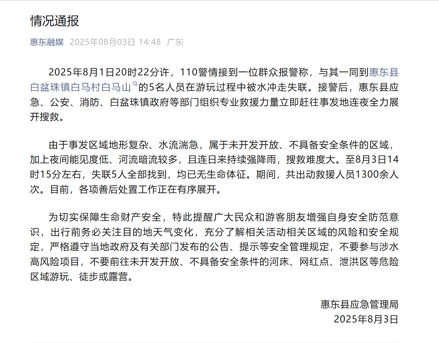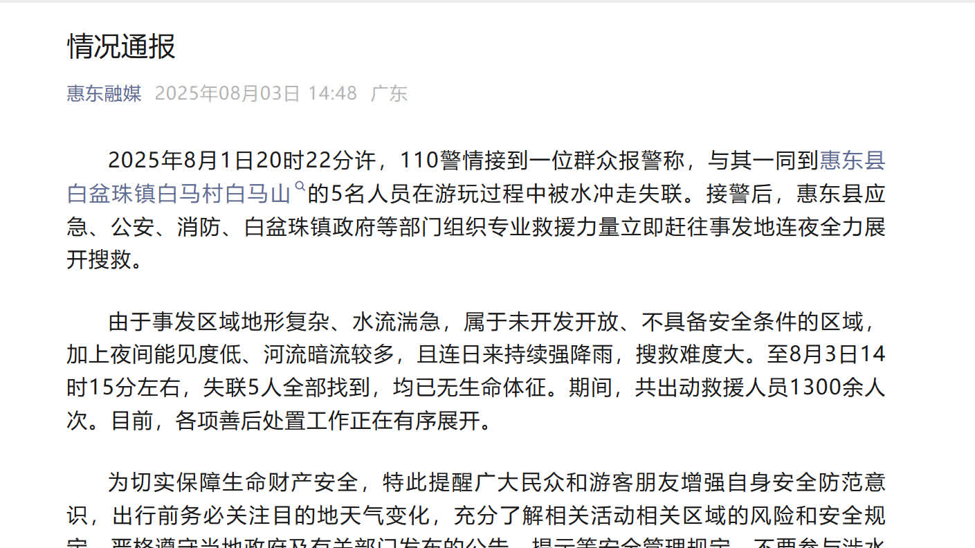 通報指,2025年8月1日20時22分許,110警情接到一位群眾報警稱,與其一同到惠東縣白盆珠鎮白馬村白馬山的5名人員在遊玩過程中被水沖走失聯。接警後,惠東縣應急、公安、消防、白盆珠鎮政府等部門組織專業救援力量展開搜救。由於事發區域地形複雜、水流湍急,屬於未開發開放、不具備安全條件的區域,加上夜間能見度低、河流暗流較多,且連日來持續強降雨,搜救難度大。至8月3日14時15分左右,失聯5人全部找到,均已無生命體徵。目前,各項善後處置工作正在有序展開。