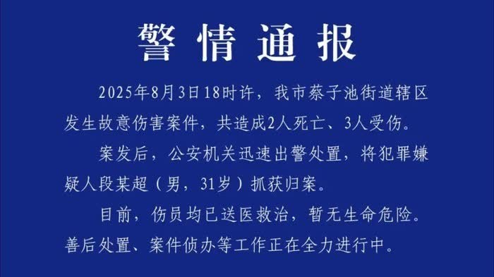 大公文匯網報道,8月3日,湖南耒陽市公安局發布警情通報稱,當日18時許,湖南耒陽市蔡子池街道轄區發生故意傷害案件,共造成2人死亡、3人受傷。案發後,公安機關迅速出警處置,將犯罪嫌疑人段某超(男,31歲)抓獲歸案。