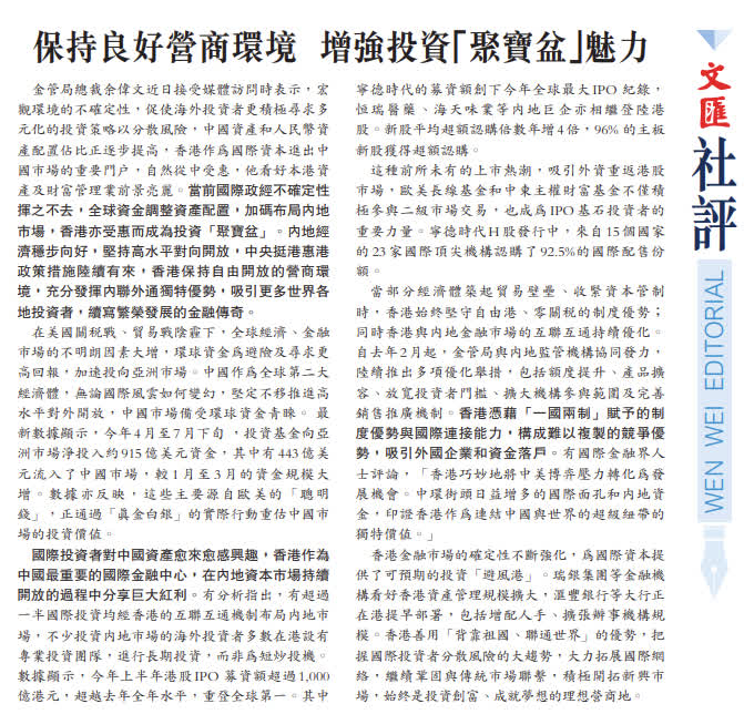 當部分經濟體築起貿易壁壘、收緊資本管制時,香港始終堅守自由港、零關稅的制度優勢;同時香港與內地金融市場的互聯互通持續優化。自去年2月起,金管局與內地監管機構協同發力,陸續推出多項優化舉措,包括額度提升、產品擴容、放寬投資者門檻、擴大機構參與範圍及完善銷售推廣機制。香港憑藉「一國兩制」賦予的制度優勢與國際連接能力,構成難以複製的競爭優勢,吸引外國企業和資金落戶。有國際金融界人士評論,「香港巧妙地將中美博弈壓力轉化為發展機會。中環街頭日益增多的國際面孔和內地資金,印證香港作為連結中國與世界的超級紐帶的獨特價值。」