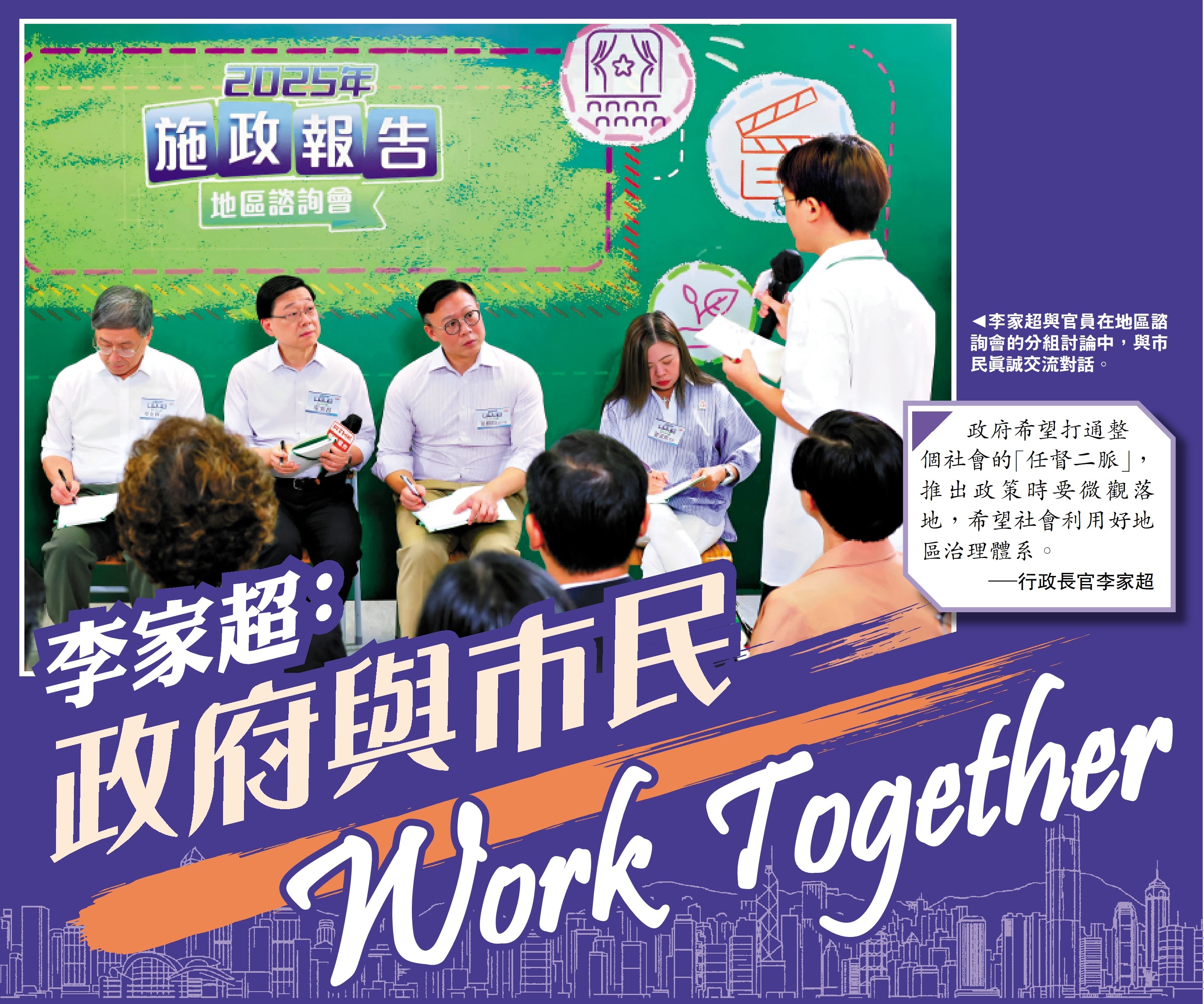 李家超感謝這位市民提出的「Work Together」概念,形容這一概念與自己的施政理念完全一致,他會責無旁貸地努力。他表示,政府在政策上做更多積極性措施,也需要市民一起打拚,「750萬人一齊努力為香港,一定做出好成績」。他強調,「Work Together」是施政核心理念,官民必須齊心合作,才能有效推動改善社區,呼籲各部門在政策執行上持續提升,真正回應市民所需。
