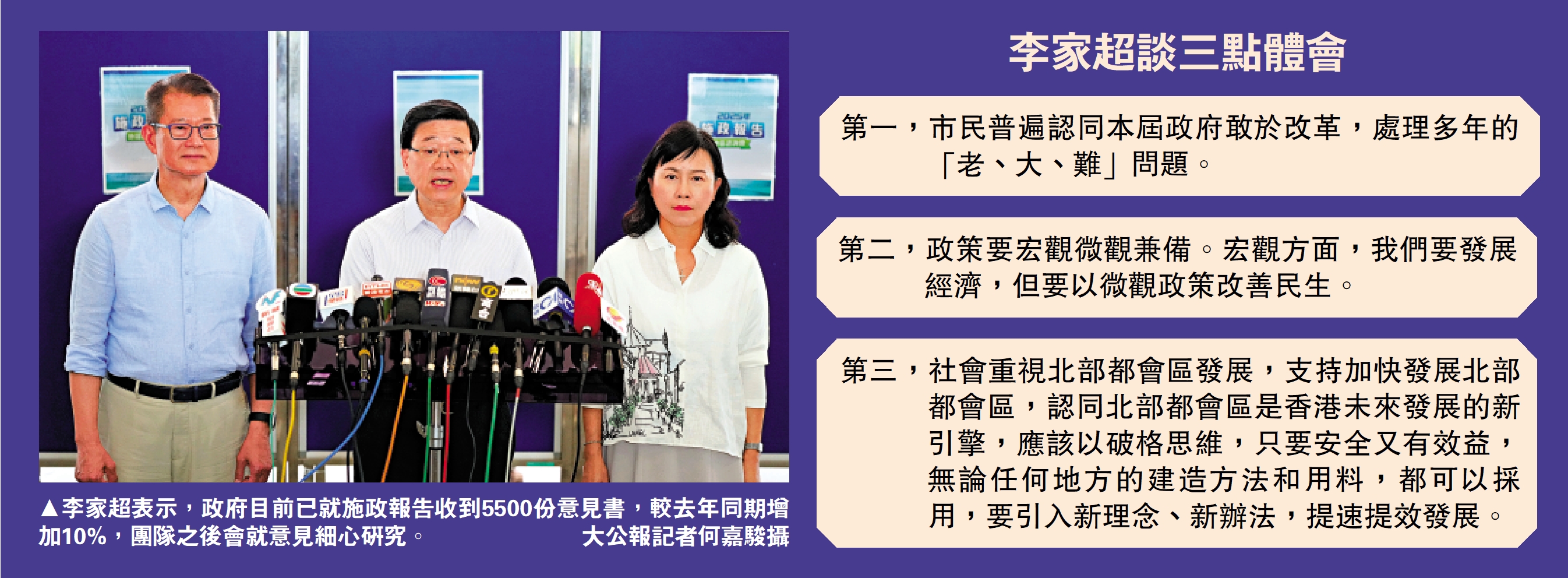 李家超分享了自己的三點體會:一,市民普遍認同本屆政府勇於改革,處理多年來「老大難」問題,如以簡樸房取代劏房、解決網約車問題等;二,政策要宏觀微觀兼備,宏觀方面要發展經濟,還要以微觀政策改善民生;三,社會重視北部都會區發展並支持加速建設,認同北部都會區是未來發展新引擎。