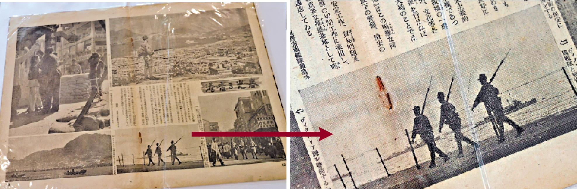 日本佔領香港後,一份由日本情報局編輯的雜誌《寫真周報》的內頁,大字標題「春光的香港」,林建強指,日本意在宣傳「香港在英國人管治下,我們現解放香港,恢復東亞民族。」他指着一幅日軍駐崗的市區街道圖,顯示日軍登陸後香港市面秩序井然,居民可以在街上散步,城市面貌不變,店舖照常營業的假象。
