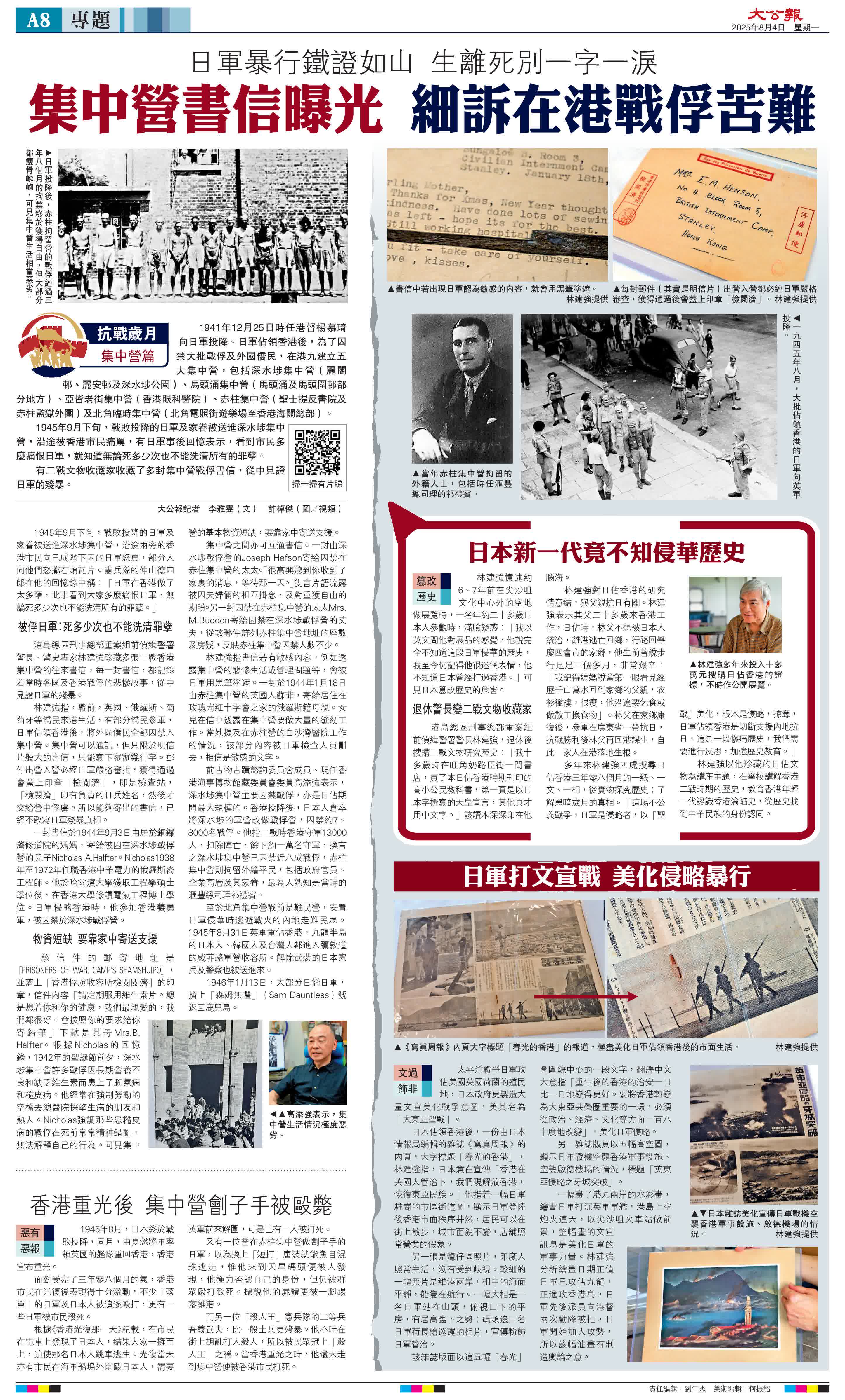 (大公報記者 李雅雯<文> 許棹傑<圖/視頻>)1941年12月25日時任港督楊慕琦向日軍投降。日軍佔領香港後,為了囚禁大批戰俘及外國僑民,在港九建立五大集中營,包括深水埗集中營(麗閣邨、麗安邨及深水埗公園)、馬頭涌集中營(馬頭涌及馬頭圍邨部分地方)、亞皆老街集中營(香港眼科醫院)、赤柱集中營(聖士提反書院及赤柱監獄外圍)及北角臨時集中營(北角電照街遊樂場至香港海關總部)。