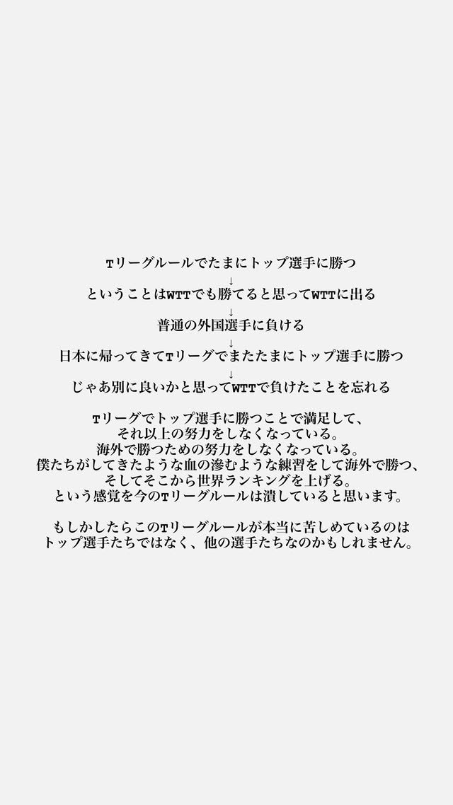 張本智和以征戰T聯賽和WTT賽事為例作對比,寫道:「在聯賽中,我們偶爾能戰勝頂尖選手,於是就覺得自己在WTT也能贏;然後去參加WTT比賽,結果輸給普通的外國選手。回來後又在聯賽中偶爾戰勝頂尖選手,就會覺得反正也還好,從而忘記了在WTT輸掉比賽的事情,滿足於在聯賽中戰勝頂尖選手,不再去做更多的努力。不再去做為了在海外獲勝而需要的努力。不再去做像我們曾經做過的那種刻苦到近乎滴血的訓練,去在海外贏得比賽,從而提升世界排名。我覺得現在的聯賽規則正在摧毀這種感覺。