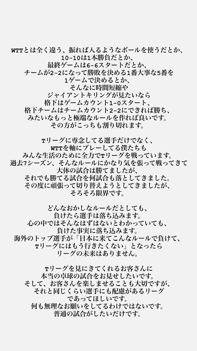 張本智和對此控訴,「如果真想縮短時間,或者想看以下克上的爆冷,不如直接制定更極端的規則,即弱隊從局分1-0開始比賽,只要將團隊比分扳成2-2就算贏。這樣反而更能讓人接受。而如今的T聯賽的規則正在摧毀運動員們。」