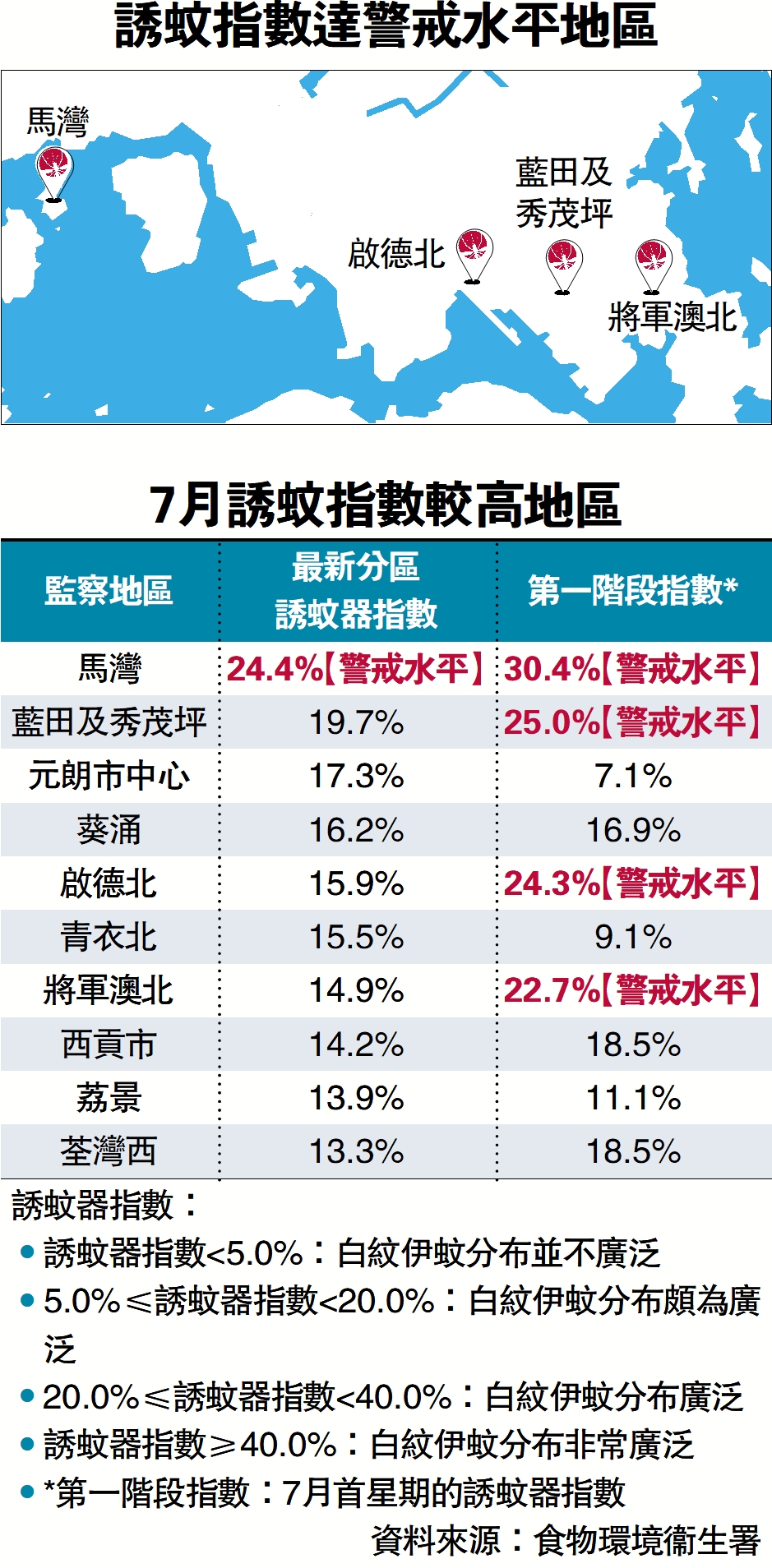 基孔肯雅熱主要經伊蚊傳播,食環署在社區共選定64個監察地區,監察誘蚊器指數。七月第一周數據顯示,市區的啟德北、藍田及秀茂坪、將軍澳北和馬灣,都超過20%的警戒水平。食環署最新的數據顯示,馬灣的誘蚊器指數達到24.4%,達到第三級別,即白紋伊蚊分布廣泛;藍田及秀茂坪、元朗市中心、葵涌等地的蚊患指數亦較高。