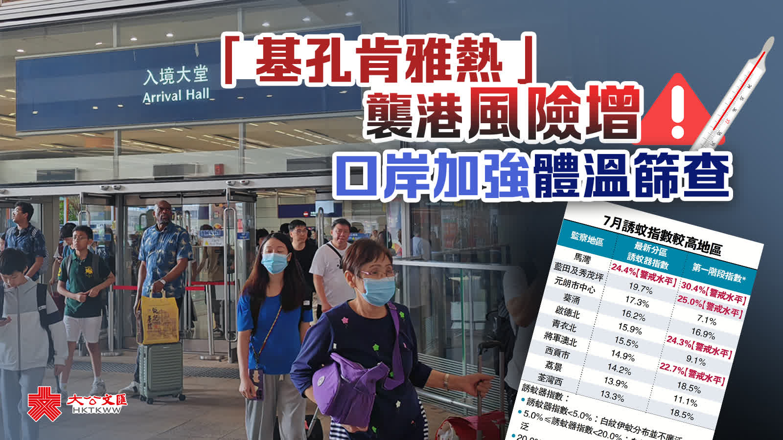 (大公報 記者 易曉彤)本港連續兩日沒有新增基孔肯雅熱個案,傳病媒介疾病科學委員會最新評估認為,本港再出現輸入個案的風險相當高,並有引致本地傳播的潛在風險。衞生防護中心在各個口岸加強基孔肯雅熱宣傳教育,並為抵港人士進行體溫篩查。