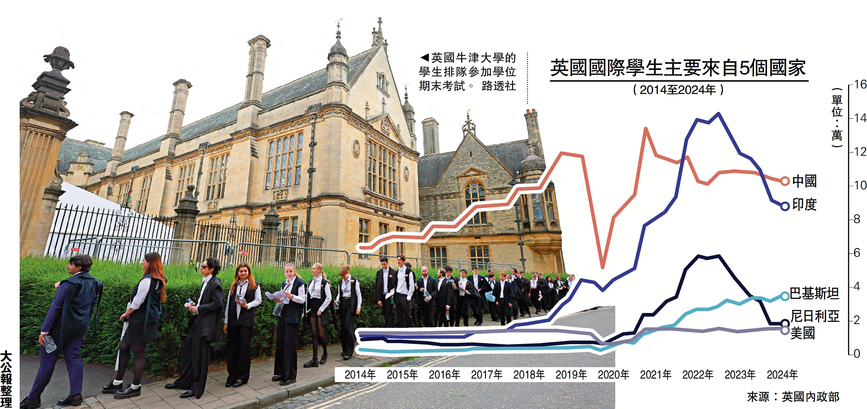 英國保守黨政府去年1月大幅收緊持學生簽證人士攜家屬移英。今年5月,英國工黨政府將申請英國永久居留權的最低居住年限從5年延長至10年,並提高對移民的英語能力要求。9月起,若英國大學未能確保其不被用作移民申請庇護的「後門」,或將被禁止招收國際學生。
