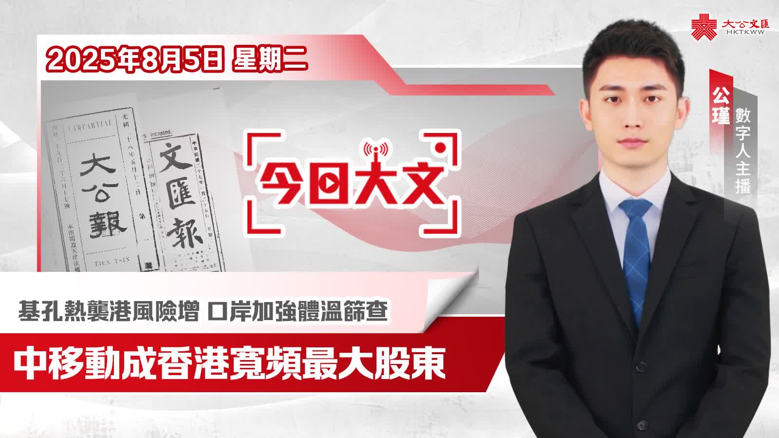今天是2025年8月5日(星期二),大公文匯網與您速覽報紙看點。