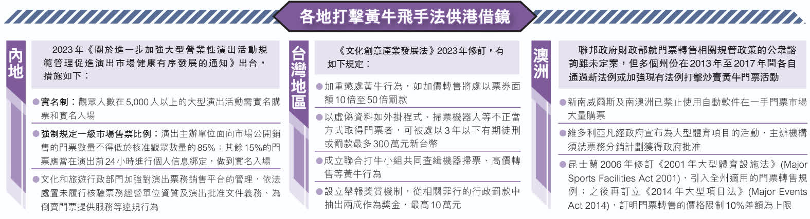 不過,發展演唱會經濟的過程中面臨不少挑戰,其中最嚴重的是票務系統的落後及炒賣黃牛飛的情況。他認為,售票方式遲遲未實行實名制,導致大量門票被黃牛包攬,令真正的歌迷難以購票。「內地早已普及實名制售票,為何香港卻總以商業理由為藉口,拒絕推行?」他直言,現行票務系統實際上助長了黃牛經濟,令演唱會經濟的收益未能真正惠及本地市民及政府稅收,建議香港應參考內地實名制售票的做法,透過立法規範票務市場,杜絕黃牛炒賣。「如果政府有決心,半年內便可完成立法程序。」