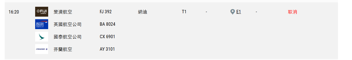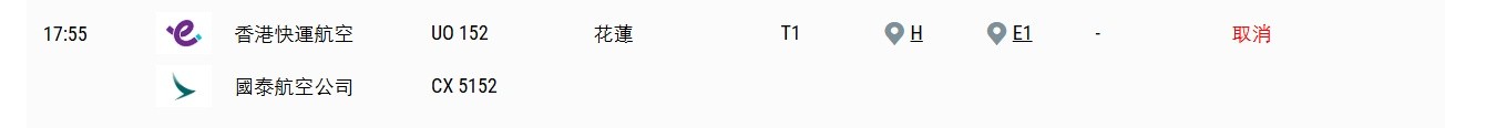 翻查資料,被取消的航班分別為原定於下午4時20分飛往納迪的斐濟航空FJ392,以及原定於下午5時55分往花蓮的香港快運UO152。